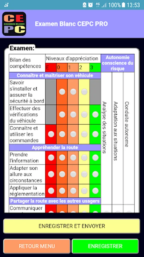 CEPC white exam is an application dedicated to teachers, instructors and driving teachers in driving schools. This application is a digitized version of the evaluation sheet in classic paper format used by driving schools to evaluate students on the part conducted for license B before the official exam.