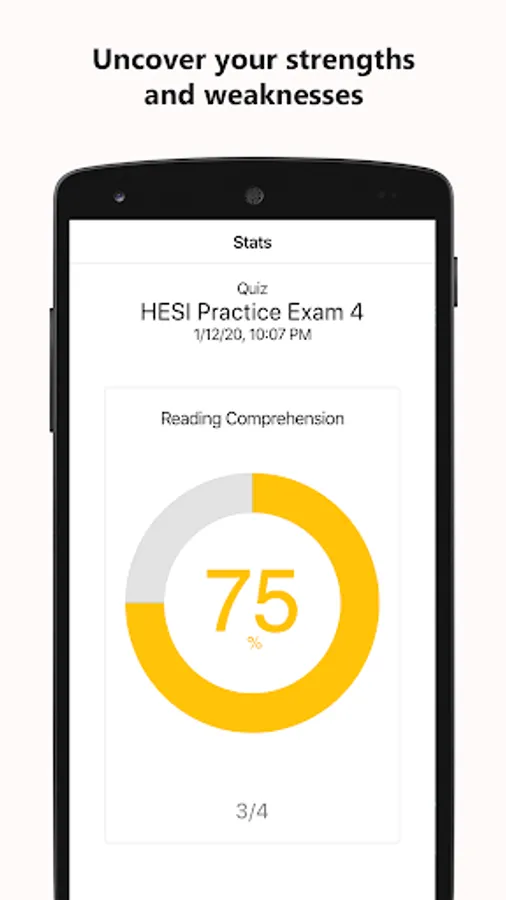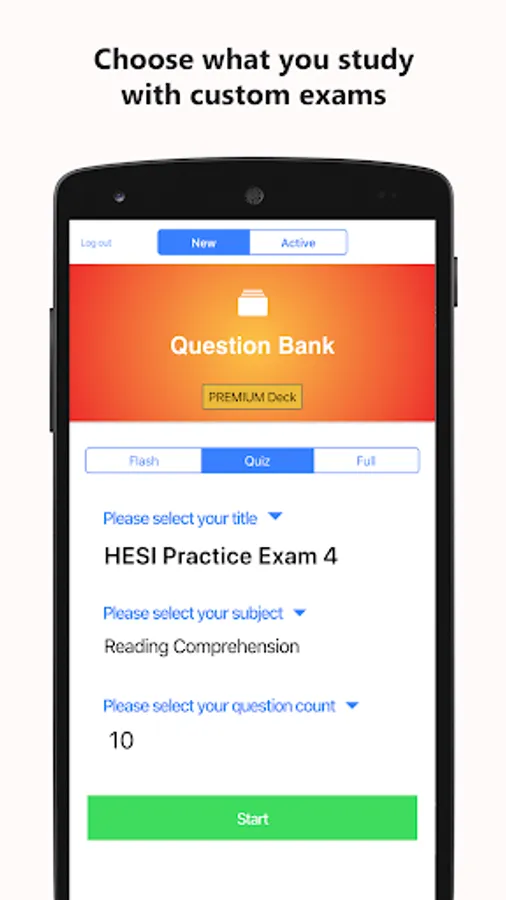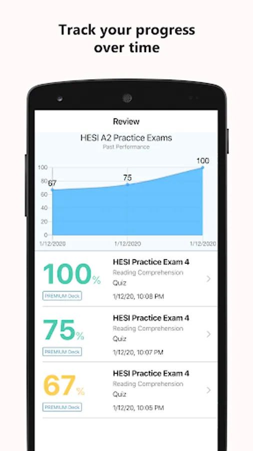 Attack specific HESI subject areas on a question-by-question basis using our flash card mode. Flash card mode makes it simple to prep anytime - whether you’re on the train, treadmill, or couch. Questions will be randomly selected from any of the complete exams.