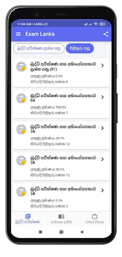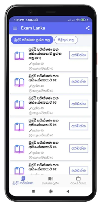 මෙම යෙදුම මගින් මාර්ග ගත ක්රමයට ප්රශ්න පත්ර ලබා ගෙන පිළිතුරු දිය හැක. එම මොහොතේදීම පිළිතුරු බලා ගත හැක. මෙහි අන්තර්ගත වනුවේ බුද්ධි පරීක්ෂණ , අවබෝධය ප්රශ්න සහ සාමාන්ය දැනීම ප්රශ්න පිළිතුරු සමග ලබා ගත හැක.