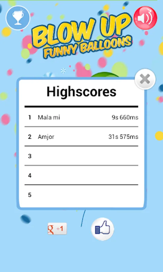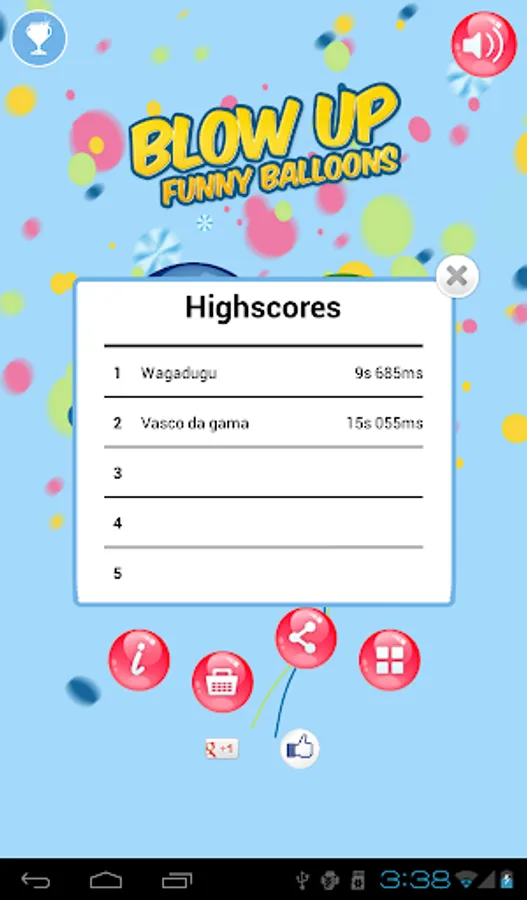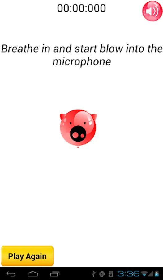 Choose one of the three balloons, take a lot of air and blow into the microphone until the balloon burst. Try different blowing techniques, so as to get the best time. When the balloon bursts, inflate again and try to improve your score. Choose from three different colored balloons and the pig balloon :)