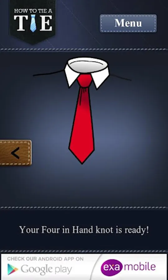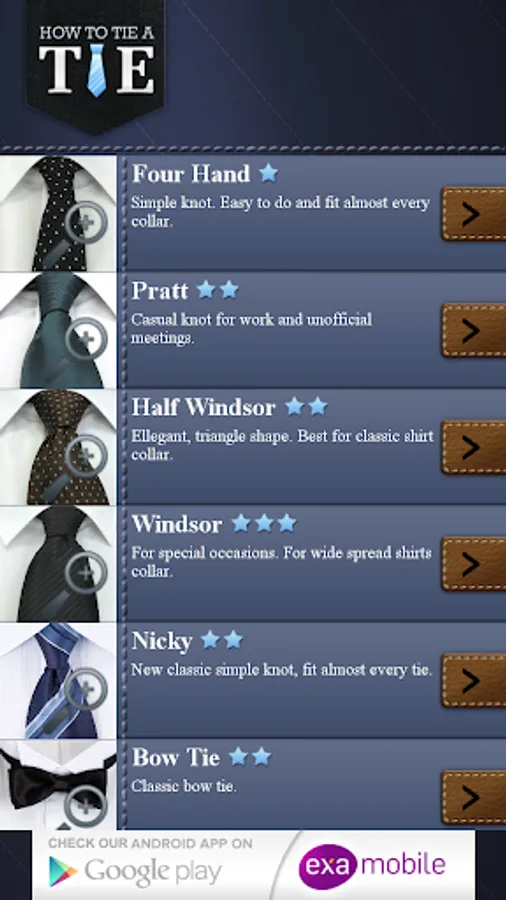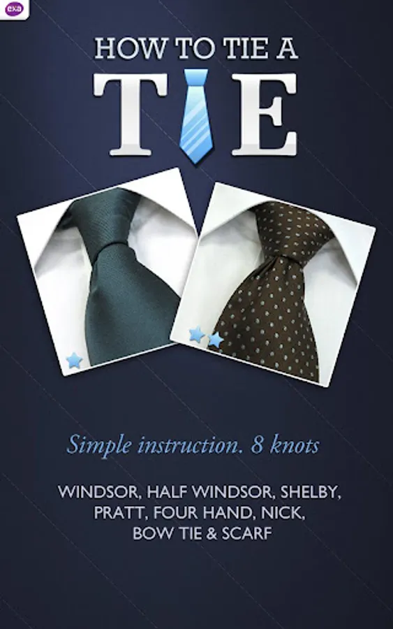 There are many ways to tie a tie. Our app includes the most popular knots: the Half-Windsor, the Windsor, the Pratt knot and the Four-in-Hand knot. The clear visual instructions will guide you step by step in how to tie every kind of knot:
