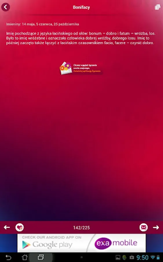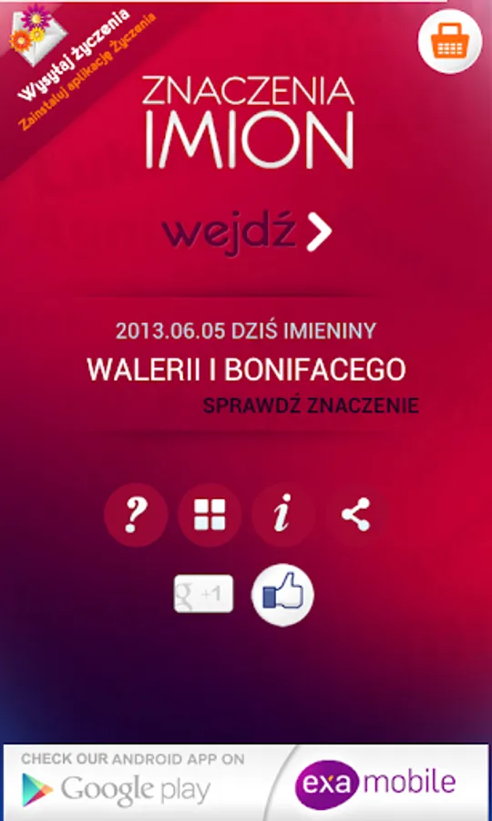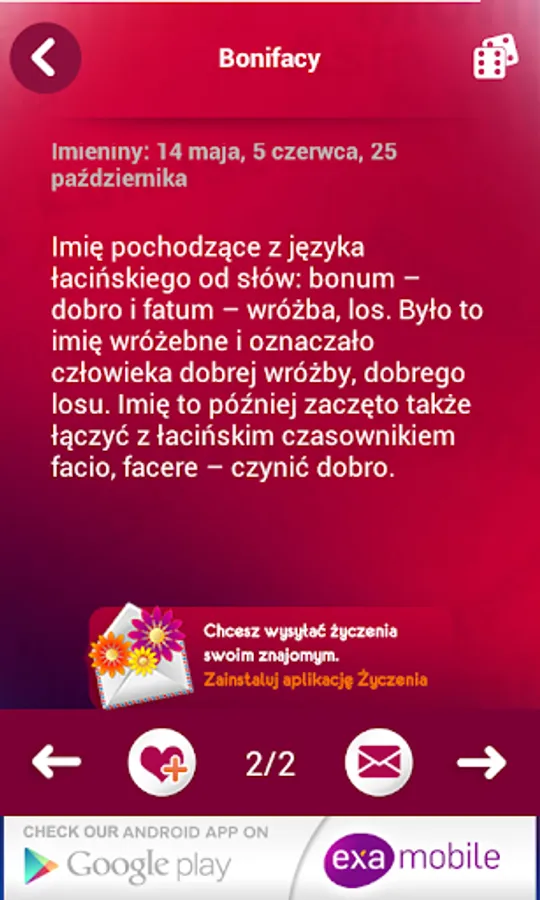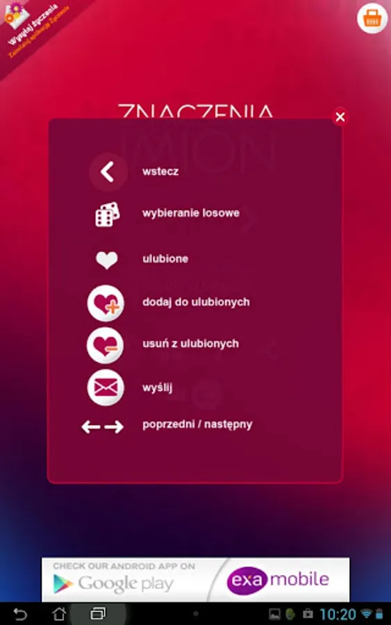 - wysyłanie znaczeń imion za pomocą maila, sms i innych zainstalowanych w telefonie komunikatorów