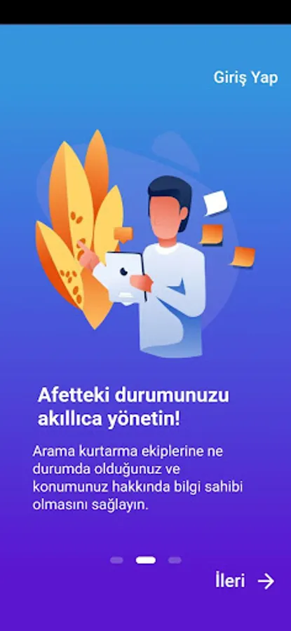 The purpose of the Natural Disaster Mobile Application is to provide interpersonal communication for the communication problem caused by mobile operator interruptions in case of disaster, to learn how much the person is affected by the disaster, to increase the location accuracy in the response of aid organizations to the disaster area according to this information and the location of the person.