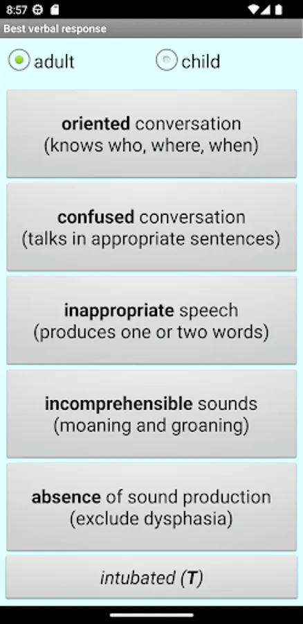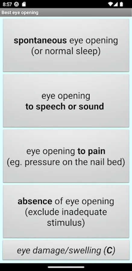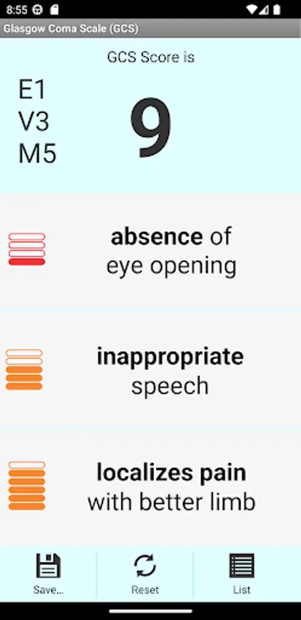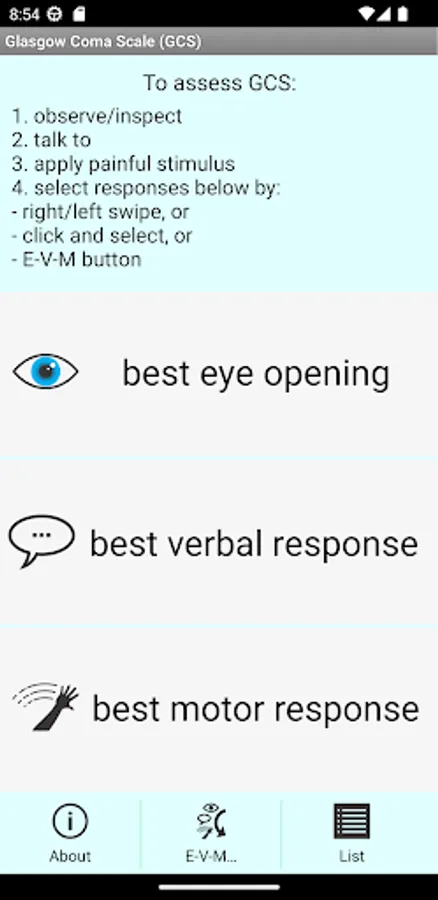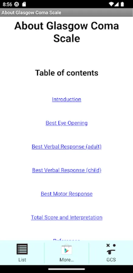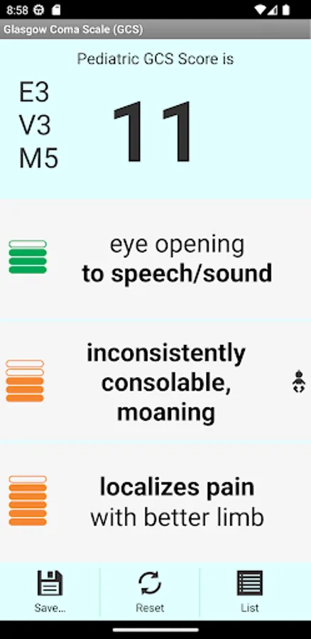 This application helps in the assessment of Glasgow coma scale, provides instructions how to perform examination and how to assign scores, calculates Glasgow coma score and allows saving the scores in the searchable database for later comparison/follow up.