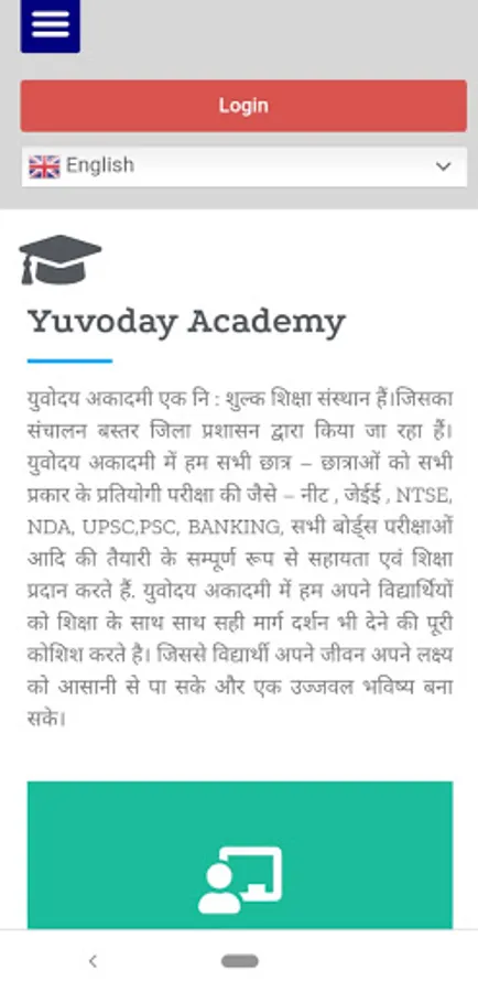 युवोदय अकादमी एक नि : शुल्क शिक्षा संस्थान हैं।जिसका संचालन बस्तर जिला प्रशासन द्वारा किया जा रहा हैं।युवोदय अकादमी में हम सभी छात्र – छात्राओं को सभी प्रकार के प्रतियोगी परीक्षा की जैसे – नीट , जेईई , NTSE, NDA, UPSC,PSC, BANKING, सभी बोर्ड्स परीक्षाओं आदि की तैयारी के सम्पूर्ण रूप से सहायता एवं शिक्षा प्रदान करते हैं. युवोदय अकादमी में हम अपने विद्यार्थियों को शिक्षा के साथ साथ सही मार्ग दर्शन भी देने की पूरी कोशिश करते है। जिससे विद्यार्थी अपने जीवन अपने लक्ष्य को आसानी से पा सके और एक उज्जवल भविष्य बना सके।