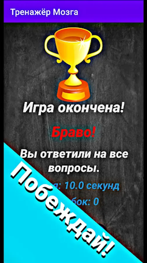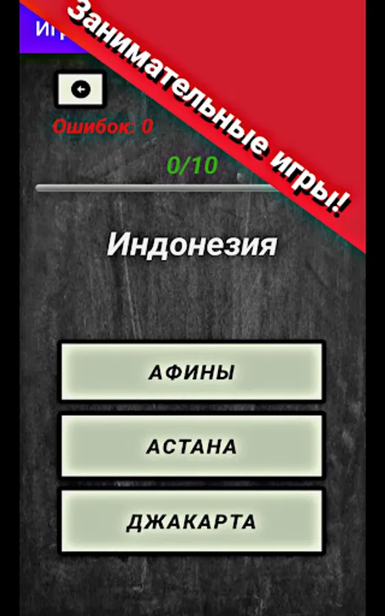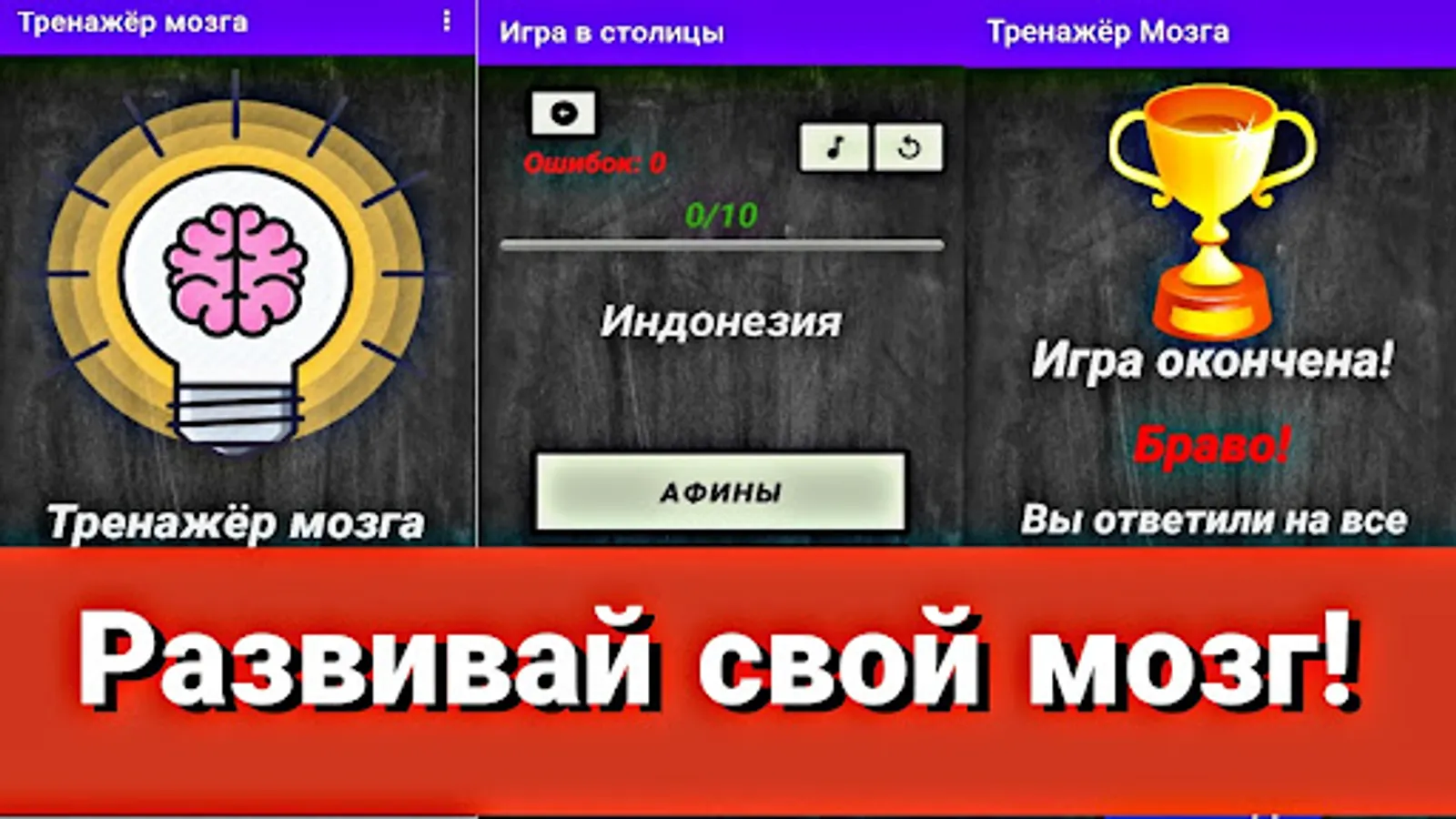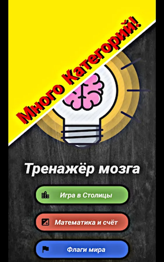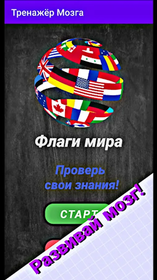 In this application you can test your knowledge of geography (capitals, flags), mathematics (calculus). The application helps to develop attention and memory.