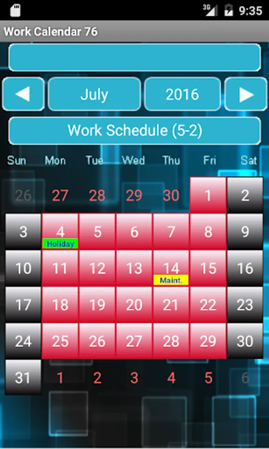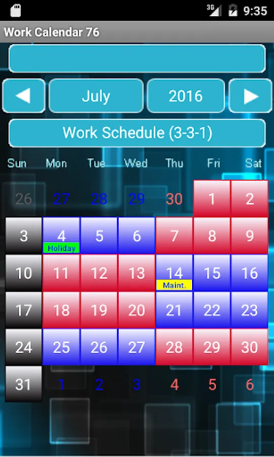 This calendar has been specifically designed for the employees working at Crown plant 76. This application will provide those individuals with a work schedule containing the ability to change from a 4-4 schedule to a 3-3-1 or 5-2. Set holiday dates along with vacations, maintenance days, overhaul, overtime, and etc.