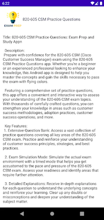 Prepare with confidence for the 820-605 CSM (Cisco Customer Success Manager) exam using the 820-605 CSM Practice Questions app. Whether you're a beginner or an experienced professional looking to enhance your knowledge, this Android app is designed to help you master the concepts and gain the skills necessary to pass the exam with flying colors.