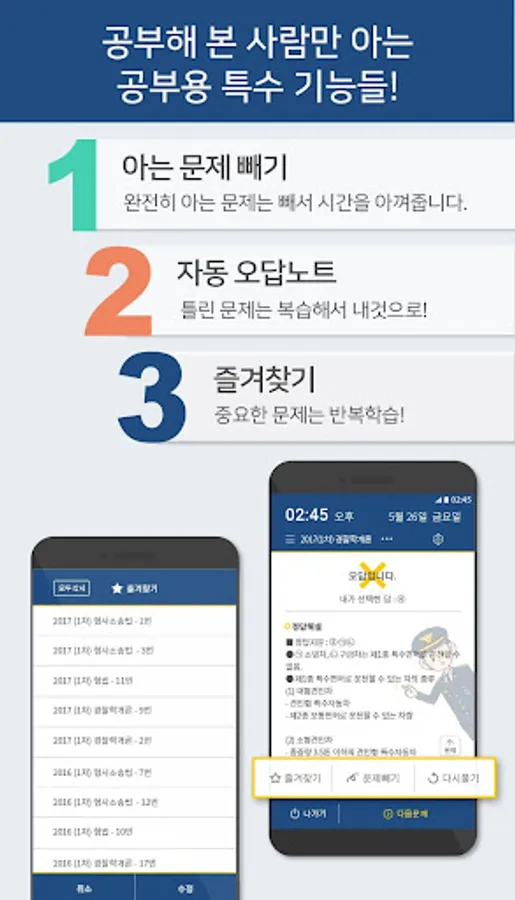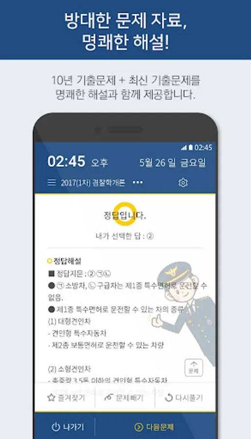 폰만 켜만 자동으로 경찰공무원 기출문제를 볼 수 있습니다. 문제푸는게 번거롭다면 한번 쭉 읽고 부담없이 틀리세요. 명쾌한 해설을 보고 한번만 읽어보고 지나쳐도 큰 도움이 됩니다.