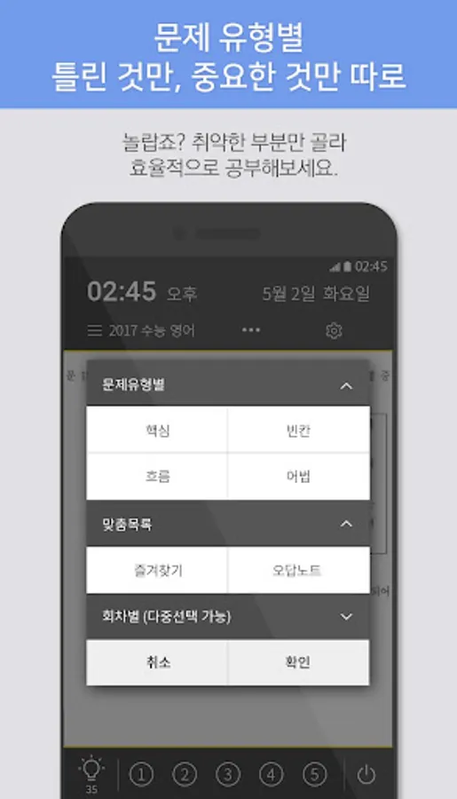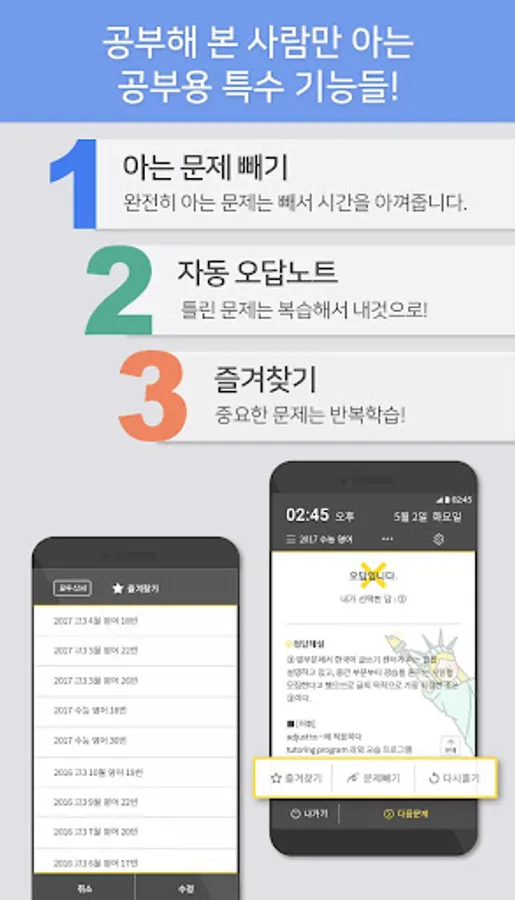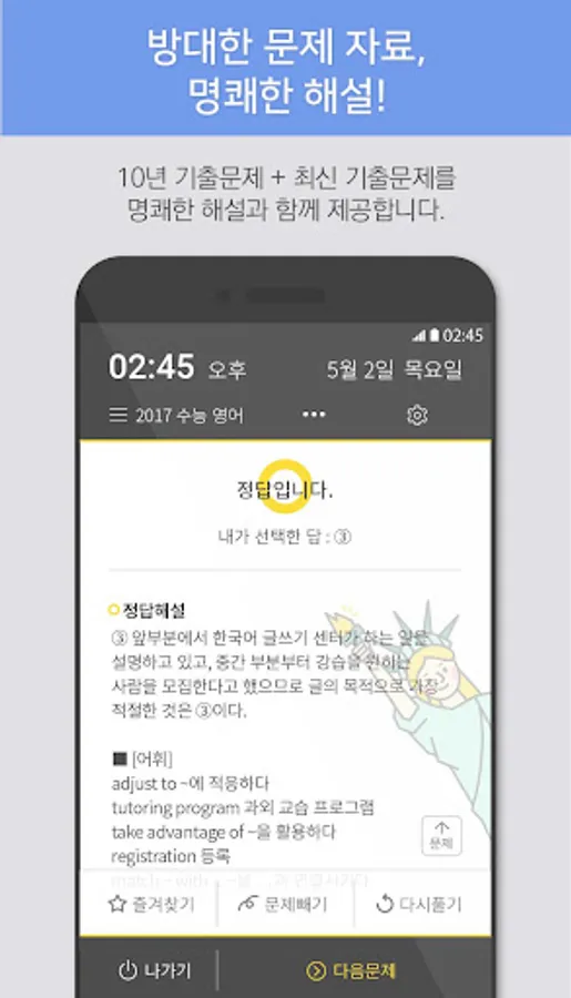 We provide dozens of previous questions in the English Scholastic Ability Test and major mock exams, including correct answers and incorrect answers, without omission. And the exams to be conducted in the future are updated immediately, so this one app is enough to conquer previous questions.