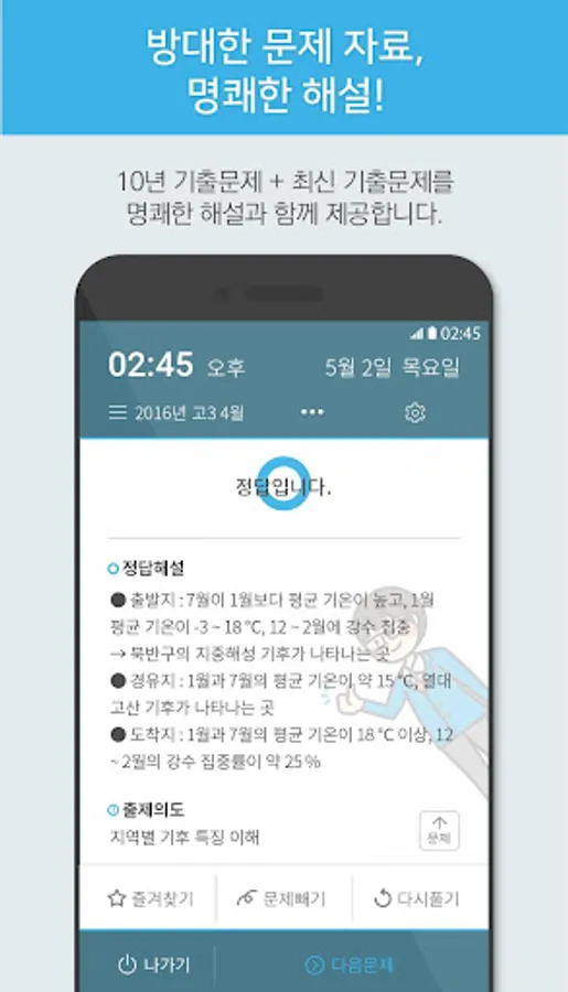 폰만 켜만 자동으로 수능 사탐-세계지리 기출문제를 볼 수 있습니다. 문제푸는게 번거롭다면 한번 쭉 읽고 부담없이 틀리세요. 명쾌한 해설을 보고 한번만 읽어보고 지나쳐도 큰 도움이 됩니다.