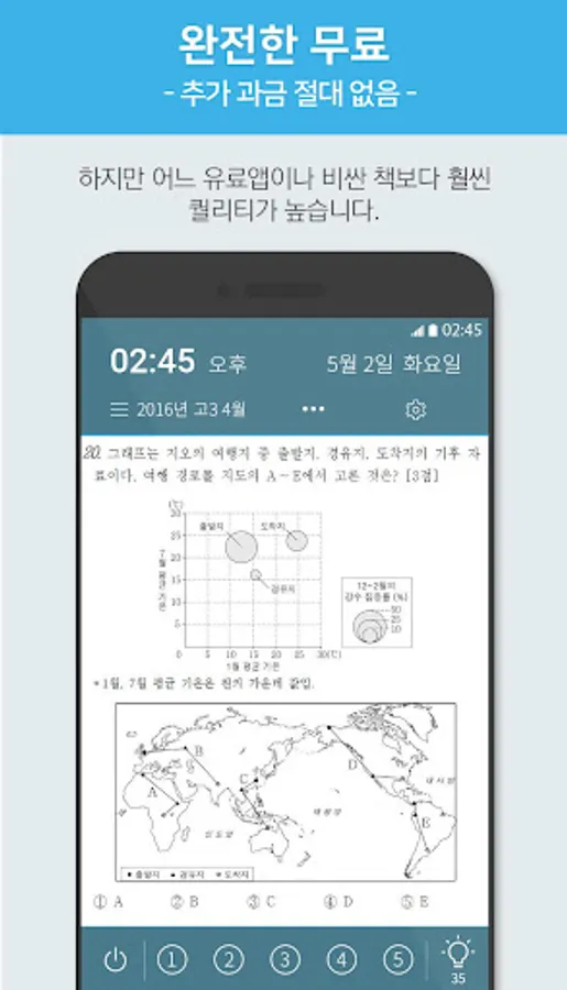 세계지리 수능시험 및 주요모의고사의 기출문제 수십회분을 정답해설+오답해설까지 전부 빠짐없이 제공합니다. 그리고 추후 실시될 시험들도 곧바로 빠짐없이 업데이트되니 이 앱하나면 기출문제정복은 충분합니다
