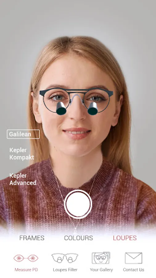 The App also holds a ‘Loupe Filter’ where you can try a pair of ExamVision loupes with different frames, colours and also with the various loupe systems ExamVision offers – Galilean HD, Kepler Kompakt, and Kepler Advanced.