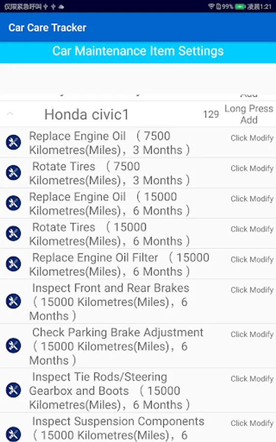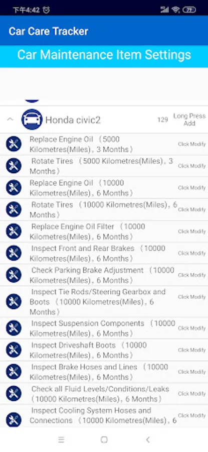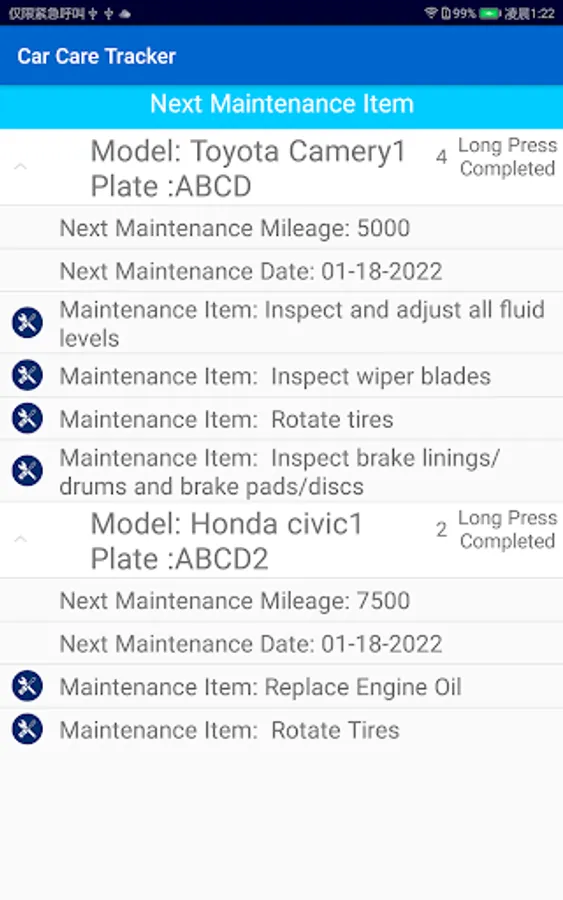 -View/add/update/delete maintenance items for multiple cars (oil change, brake, tire, battery, etc.)