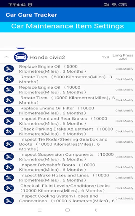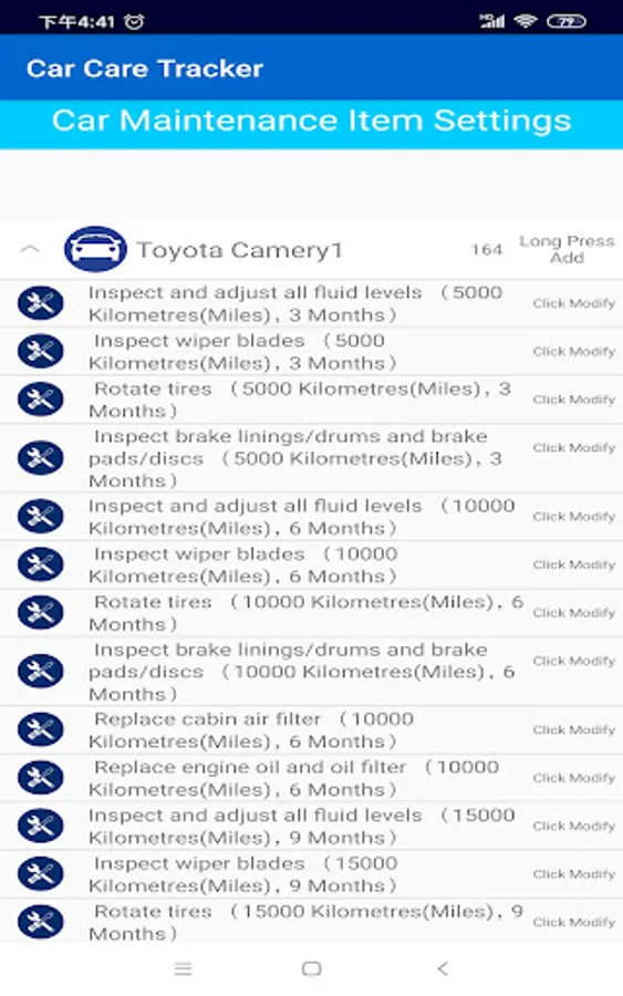 For the maintenance reminder function, the application provides comprehensive logging and reminders for almost all regular car services based on both mileage and dates, such as oil change, tire rotation, wheel alignment, air filter change, coolant flush, transmission fluid change, brake pad change, timing belt replacement, annual inspection and spark plug replacement. Even more, you can create your own customized service reminders, . With just a glance at your phone, you will have all the service records at hand.