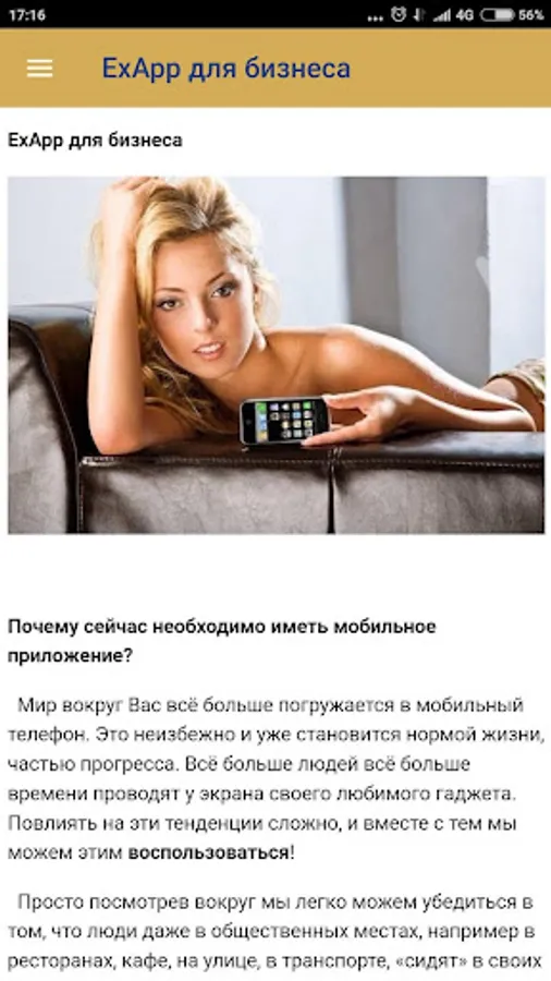 2. Easy. Collect application on native constructor ExAppmozhet any grandmother or a child who can click a mouse button. Just like any owner of any business with his own, without spending time on programming courses and money on designers and programmers.