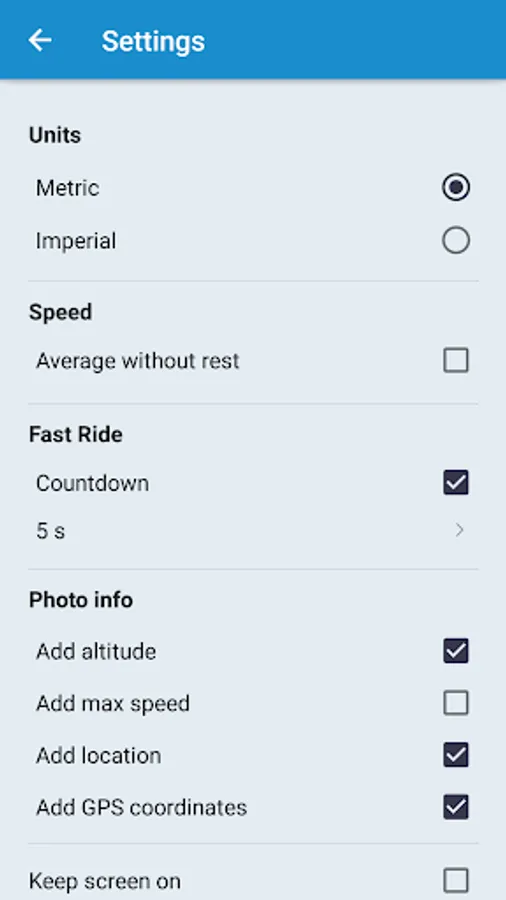 - special feature "Fast Ride" to make a separate measurement of maximum speed, time and distance to any section and time