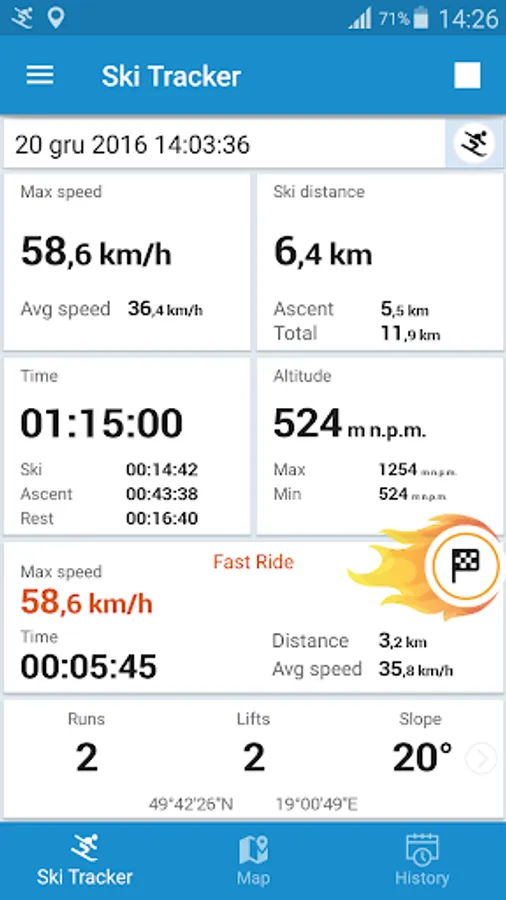 Ski Tracker is an application for all who love snow and winter sports. Useful for skiers and snowboarders. Measure the maximum skiing speed, tracks, distance, mark the slopes on the map and provide full statistics of your winter sports activity.