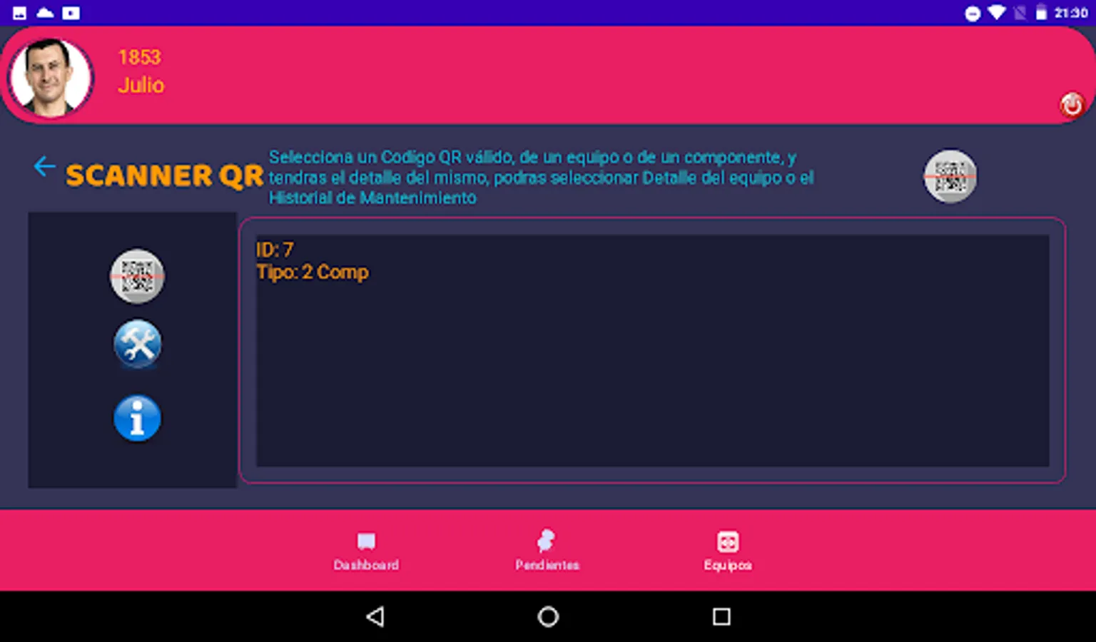 - Scan QR Codes (Created from the Desktop App), of the equipment, and thus be able to see: Equipment details or Your Maintenance History