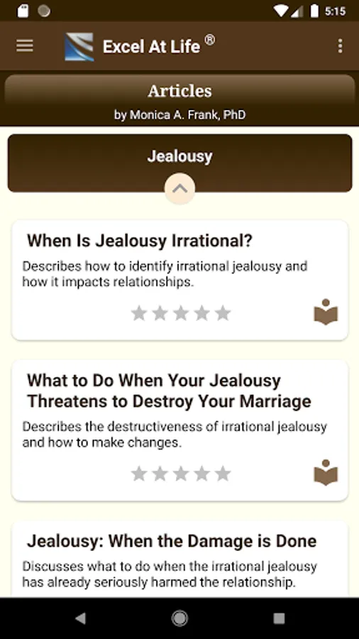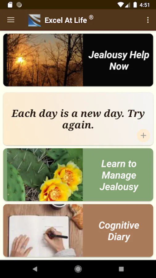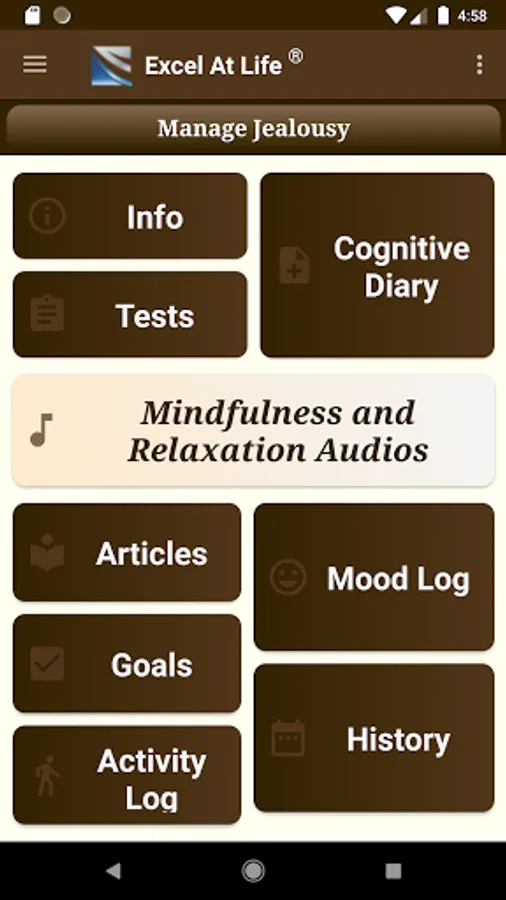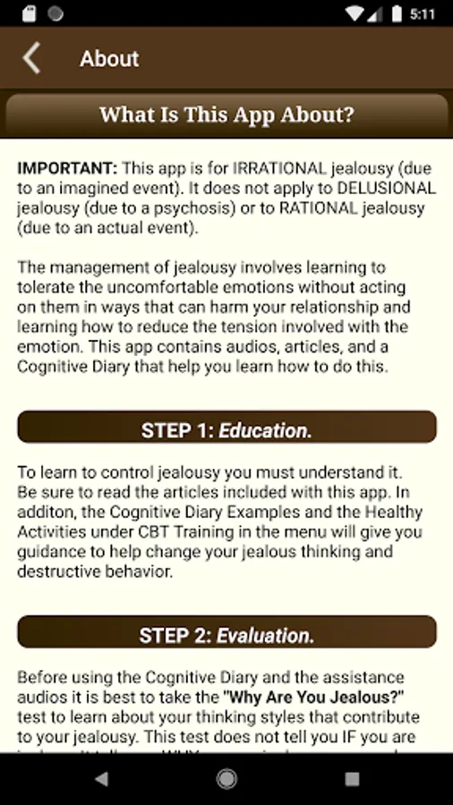 Jealousy CBT Tools by Excel At Life teaches you how to use the cognitive-behavioral therapy (CBT) methods in a simple format to learn how to manage irrational jealousy. The tools provided in this app are derived from the CBT research base and developed into a user-friendly format by a psychologist with over 30 years of clinical experience.