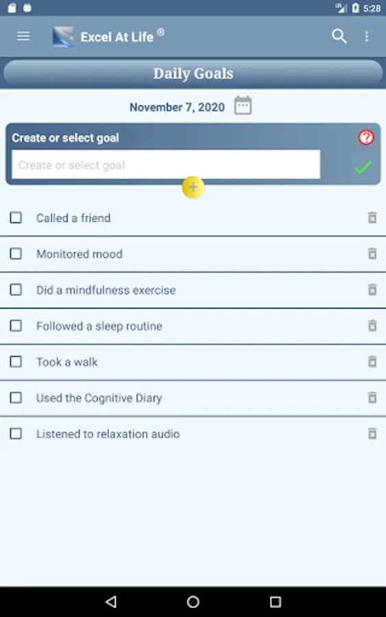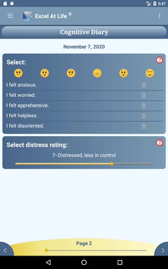 These CBT methods can be used as self-help for minor issues or can be used in collaboration with your therapist to develop a treatment plan best suited to your situation. The Daily Goals feature can be used to record your plan and completed activities.