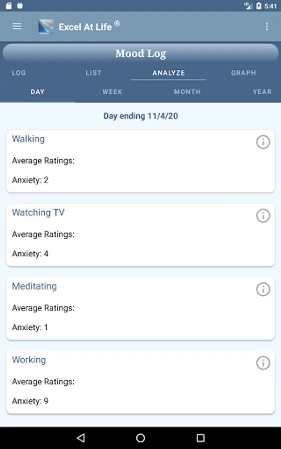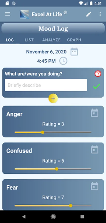 • mood analysis feature: shows your average mood ratings for different actions or events