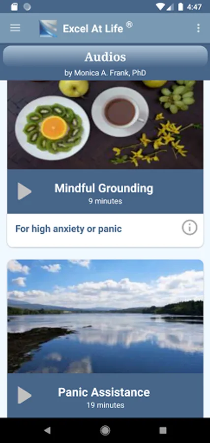 Learn about the methods used to manage panic and get relief from anxiety. Relaxation, mindfulness, and teaching audios. Mood log and analysis, cognitive diary, healthy goals & more!