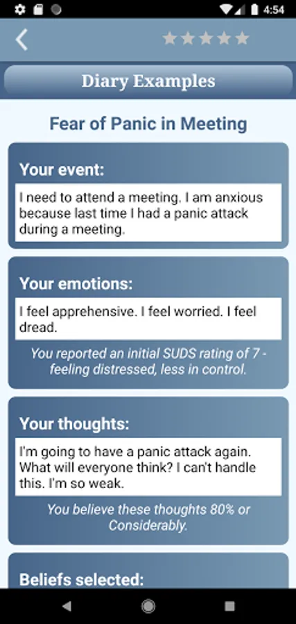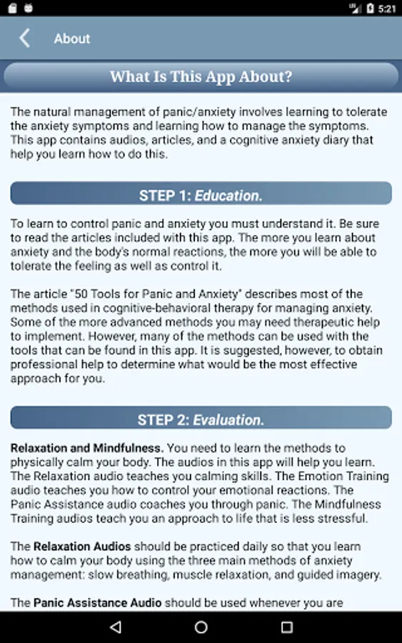 This app provides education to be an informed consumer of mental health services and contains resources to use in collaboration with a health professional. Prior to using CBT methods you should consult with your physician as sometimes panic and anxiety may be related to a physical condition.