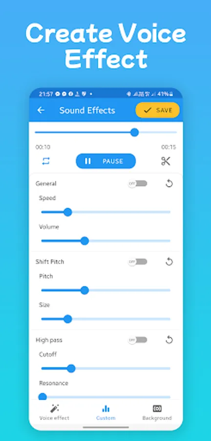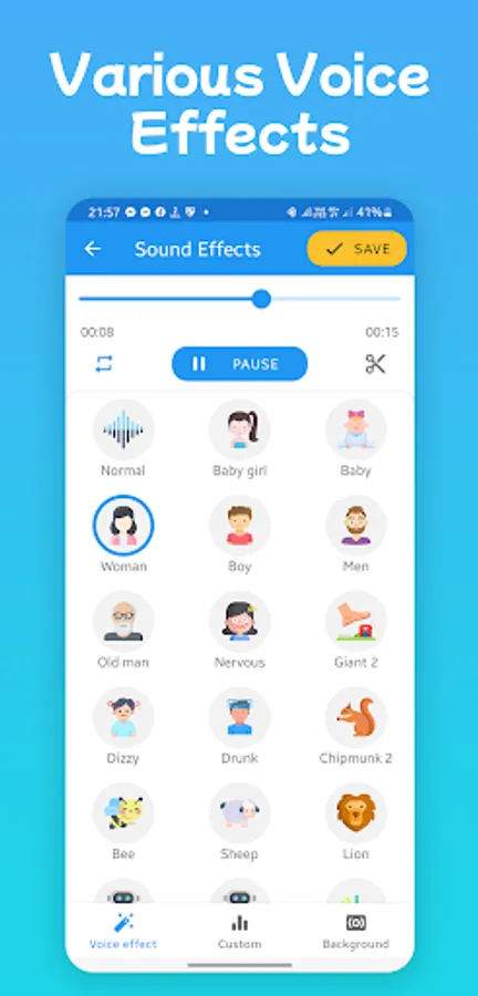 Change your voice into custom voice effect such as girl, boy, woman, boy, older man, baby, giant, alien, etc. Apply video sound effects with more than 50+ custom voice effects. Or change your voice clip with custom editing features like speed, volume, pitch, high pass, low pass, and distortion. Trim voice clip, add simple voice effect or add voice changer with effects. Change your voice with the best voice changer app made free to use just for you. Use this sound changer pro anytime and anywhere you like.