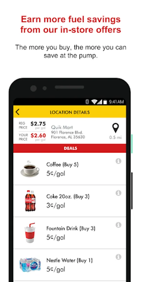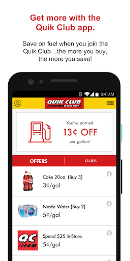 FIND DEALS. Scroll through the app to view all available cents-per-gallon offers. Plus, Quik Club members save 5¢/gal for every $25 spent in-store*.