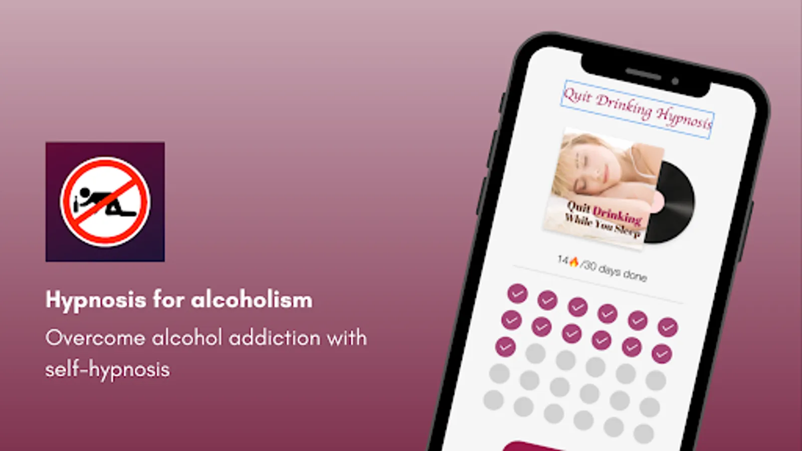 1. A streak-driven feature that helps you be motivated towards your goal of no drinking and being sober and also listen to the Quit drinking hypnosis to stay in a positive and motivated state of mind.