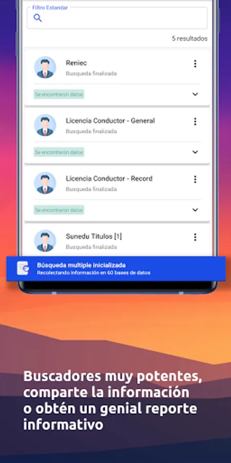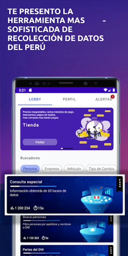 Exception Labs has at its disposal more than 800 databases with PUBLIC information IN PERU, it is a Peruvian application made by a Peruvian for Peru, it stands out how light, fast and at the same time powerful, it is your best alternative if you want to have all the information of Peru in your hands.