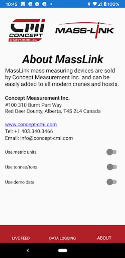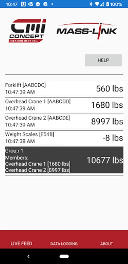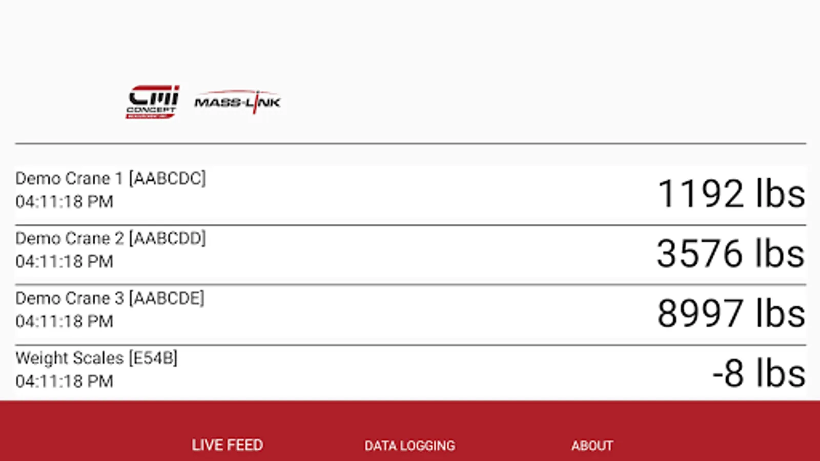 Tool for reading the weight measurements coming from Concept Measurement Inc's MassLink app. Use MassLink to measure the weight suspended from mobile and fixed cranes and display them on your phone. Features include grouping cranes together for a combined weight and setting a TARE on either individual or groups of cranes.