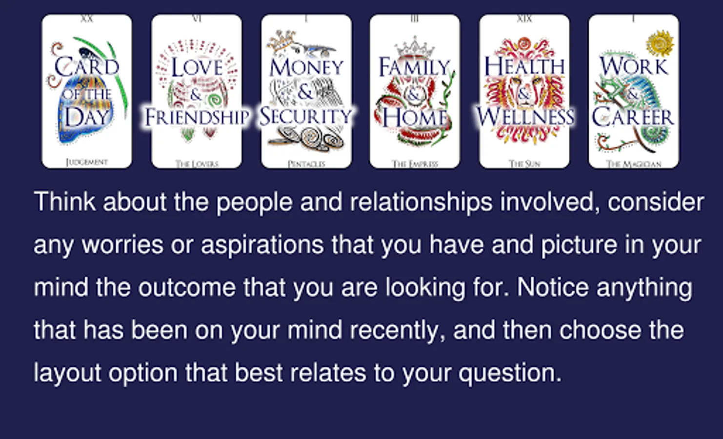 Discover daily inspiration and guidance with tarot readings at your fingertips. Get a Card of the Day and also Love & Friendship, Money & Security, Family & Home, Health & Wellness and Work & Career readings.