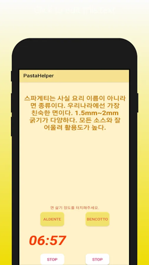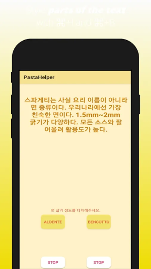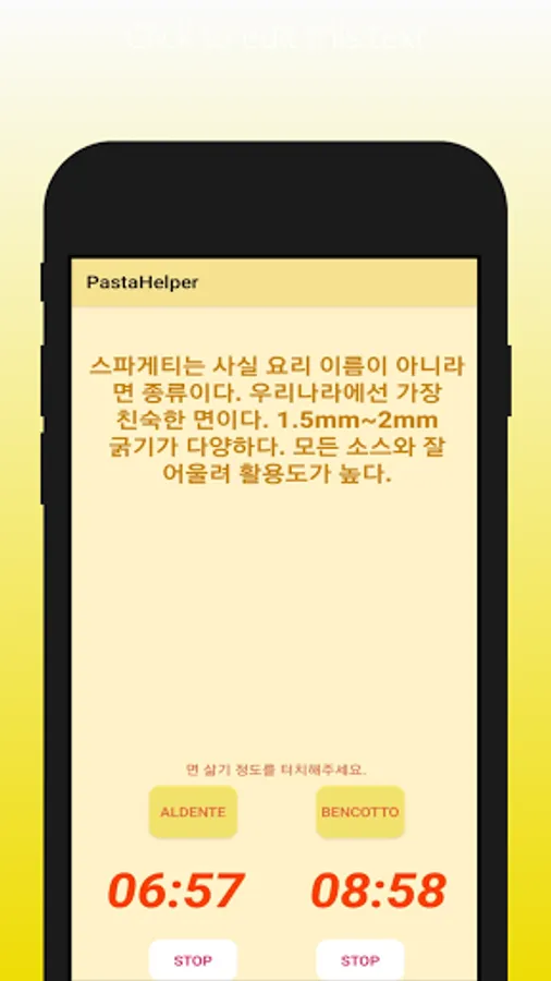 pasta helper wants to give you a different experience. No more throwing pasta noodles against the wall to make sure they're done! Depending on the characteristics, origins, and texture of each pasta, you can choose whether to boil it with aldente (undercooked texture) and bencotto (cooked texture). When the timer runs out, we will notify you with 3 vibrations, so you can watch the drama while the noodles are boiled.
