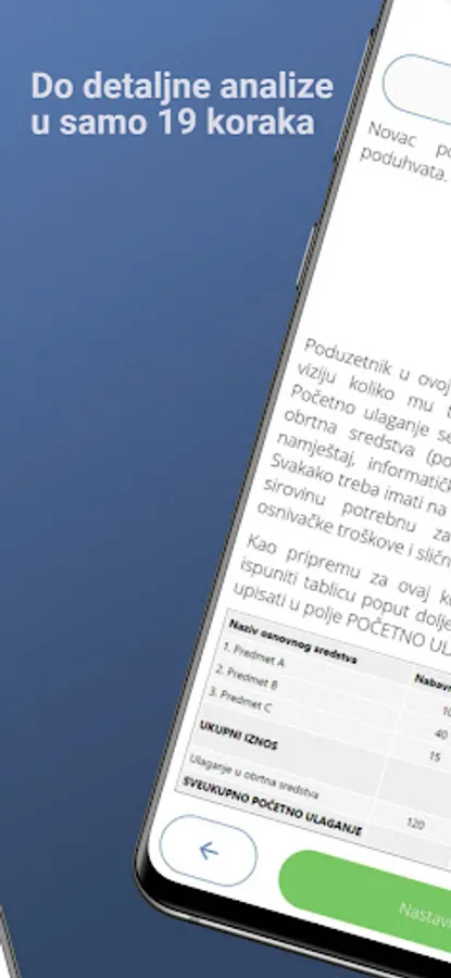 Okvirni, ali detaljni poslovni plan korisniku može služiti ako pokazatelj da li na dobrom putu, odnosno što je potrebno promijeniti kako bi poslovanje bilo uspješno. Prilikom ispunjavanja poslovnog plana, korisnik može u bilo kojem trenutku izaći iz aplikacije a da pritom njegovi podaci koji su ispunjeni ostanu spremljeni, te će prilikom ponovnog pokretanja aplikacije moći nastaviti.