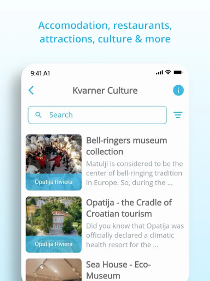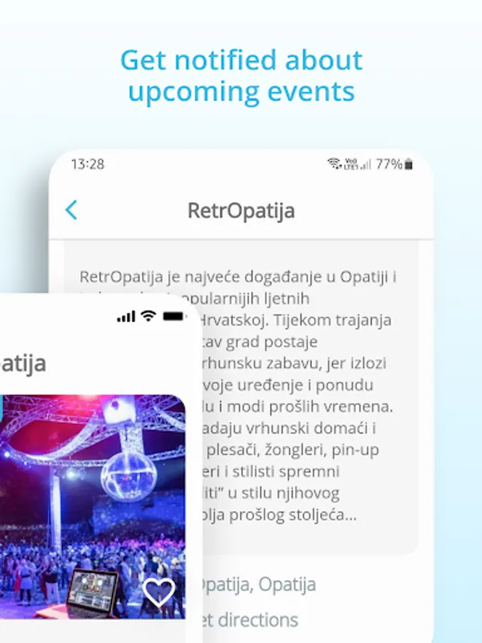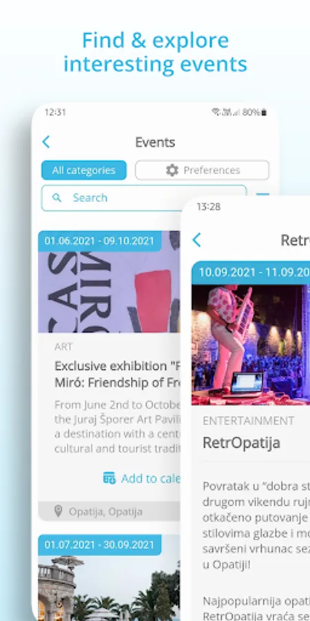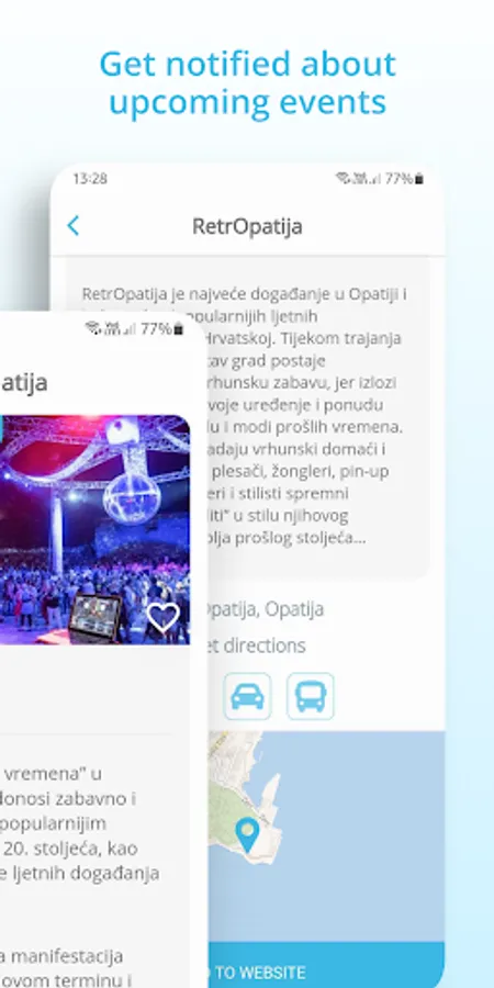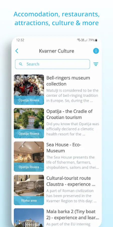 • Events - With the Visit Kvarner App it is almost impossible to miss events in Kvarner. Find events by regions, categories or according to distance from your current location. Save events to favorites, and the app will remind you before it starts! In addition to the option to save favorite events, it is also possible to add them to the personal calendars.