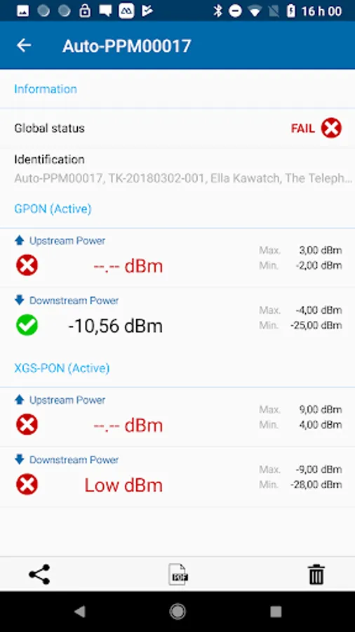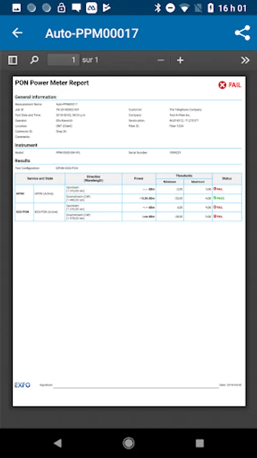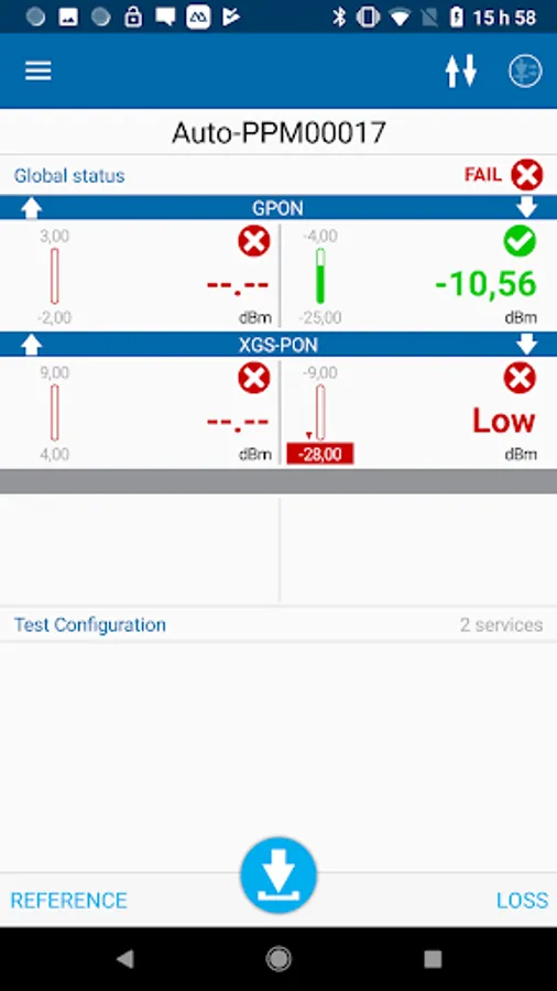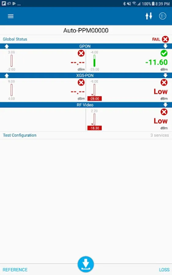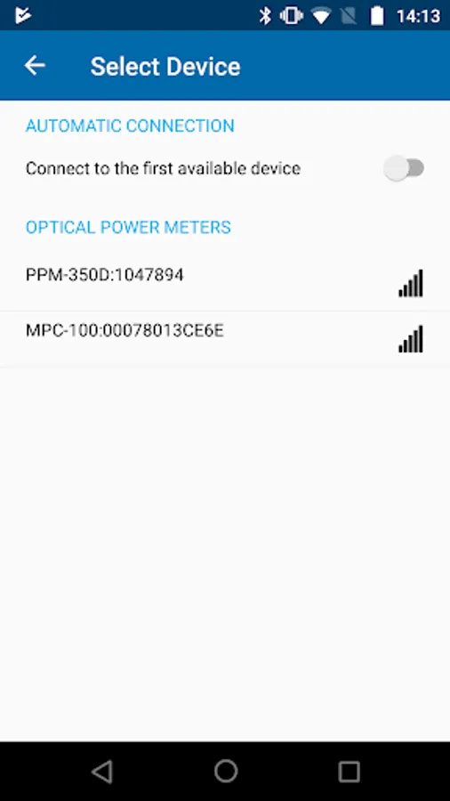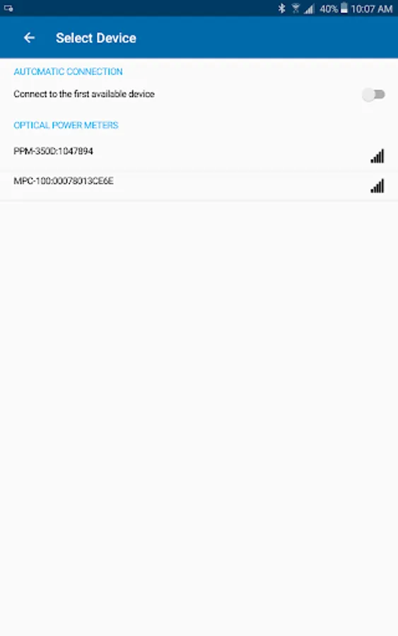 The EXFO OPM [Optical Power Meter] application can connect over Bluetooth™ to both EXFO’s PON Power meters (PPM-350D), and power checkers (MPC-100 series). When connected, the app can display live measurements and store measurements, along with the following advanced/additional features: