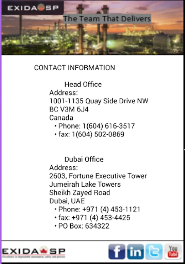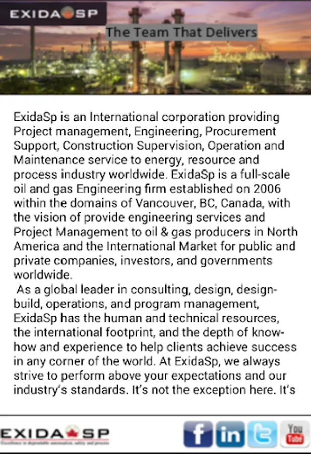 ExidaSp is an International corporation providing Project management, Engineering, Procurement Support, Construction Supervision, Operation and Maintenance service to energy, resource and process industry worldwide. ExidaSp is a full-scale oil and gas Engineering firm established on 2006 within the domains of Vancouver, BC, Canada, with the vision of provide engineering services and Project Management to oil & gas producers in North America and the International Market for public and private companies, investors, and governments worldwide.