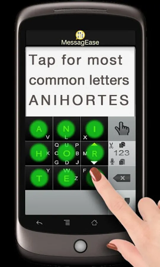 MessagEase has bigger keys, almost 3 times bigger, making them easier and faster to tap. It's optimized for touch-screen, thanks to its innovative letter arrangement.