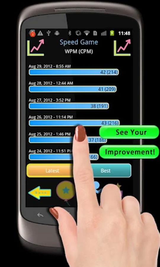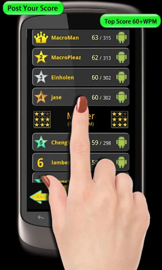 Would it make it more interesting if we tell you that MessagEase, the keyboard central to this game, is the world’s fastest touch screen keyboard? It really is. Our current champ's top speed is 84 WPM. That's 84 WORDS PER MINUTES. Most people can't type that fast with ten fingers! Many of our users are posting their typing speeds to our leaderboard everyday; they routinely text at 60-70 WPM.