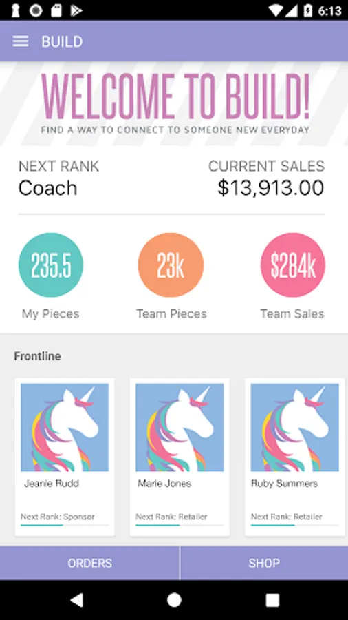 The BUILD mobile app will give you a quick view of your Retailer Dashboard, including your piece counts, T.E.A.M. piece counts, and T.E.A.M. Sales! With the BUILD app you can also easily view all of your wholesale orders, their status, and details. You will even be able to see past bonuses and your progress toward your next rank advancement!