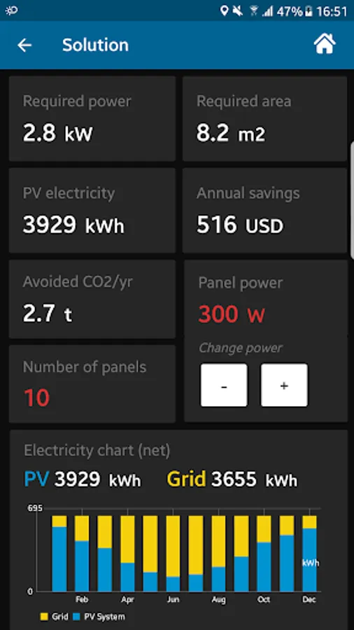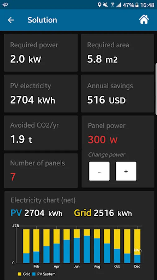 Please note that Solar Home is assuming that you have the availability of net metering in your country. The detailed electricity monthly chart consists of net values and it's taking into consideration of 1:1 ratio of the electricity between your home and the utility.