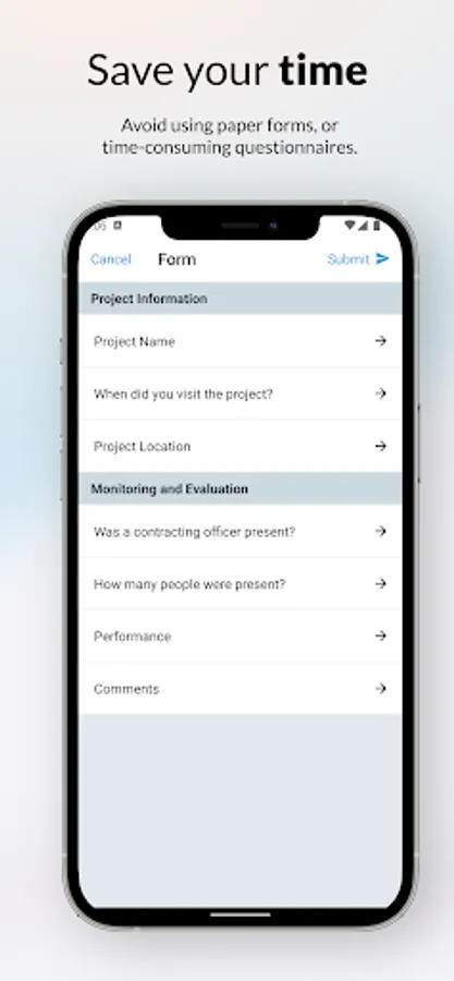 Avoid using paper forms, or time-consuming questionnaires. Instead, answer questions and record data on the move, from the field. Take advantage of geo-location features to verify your location when submitting the form.