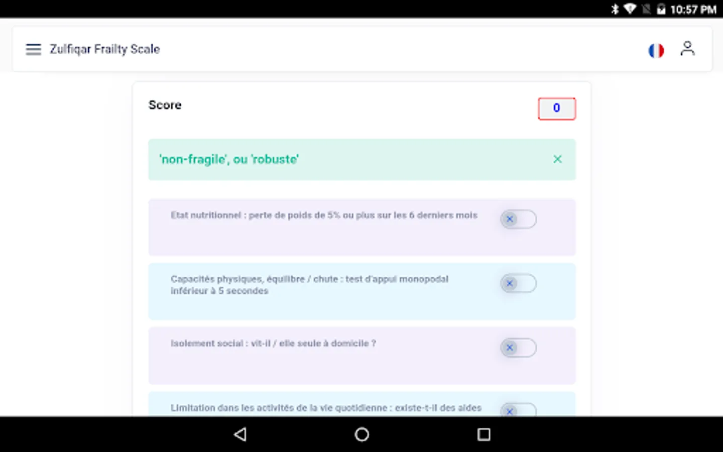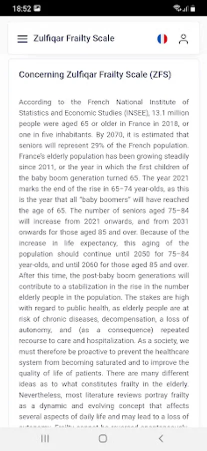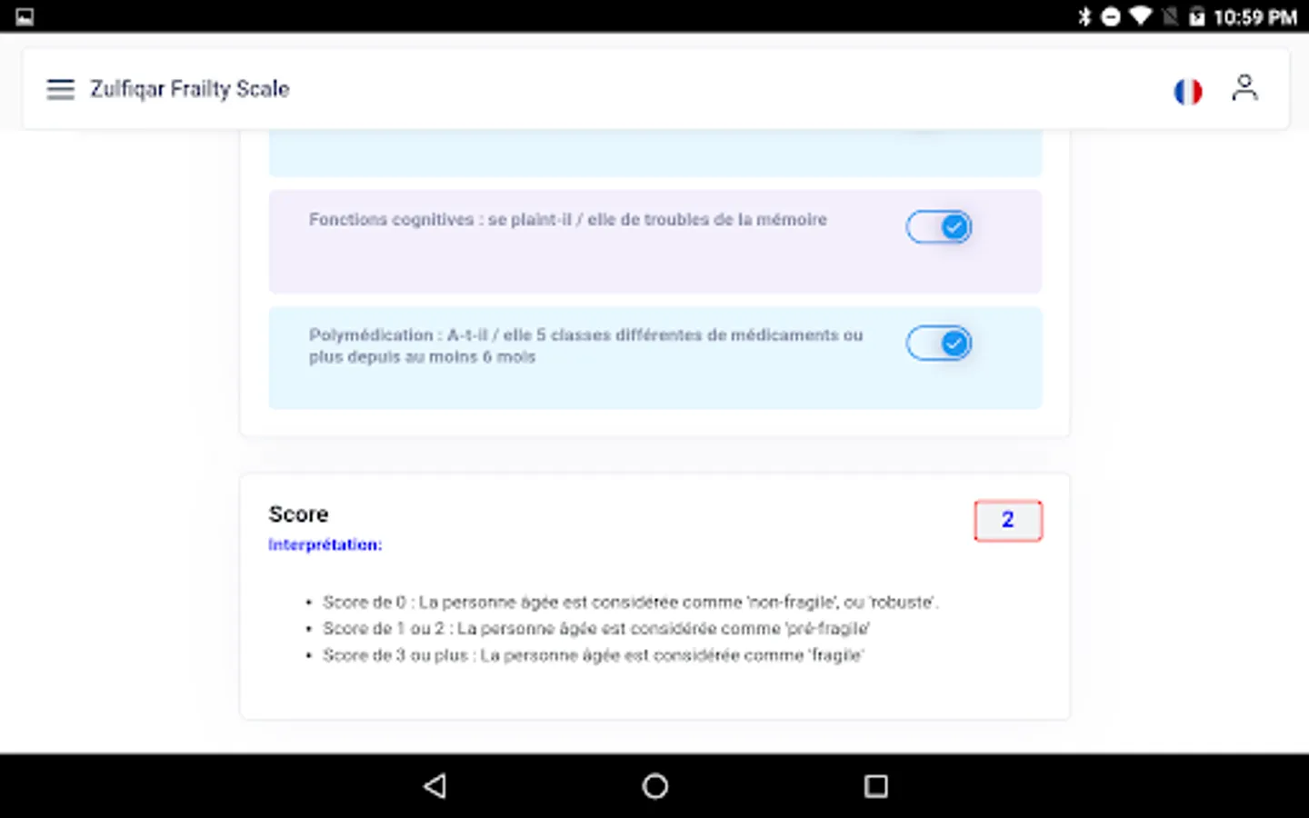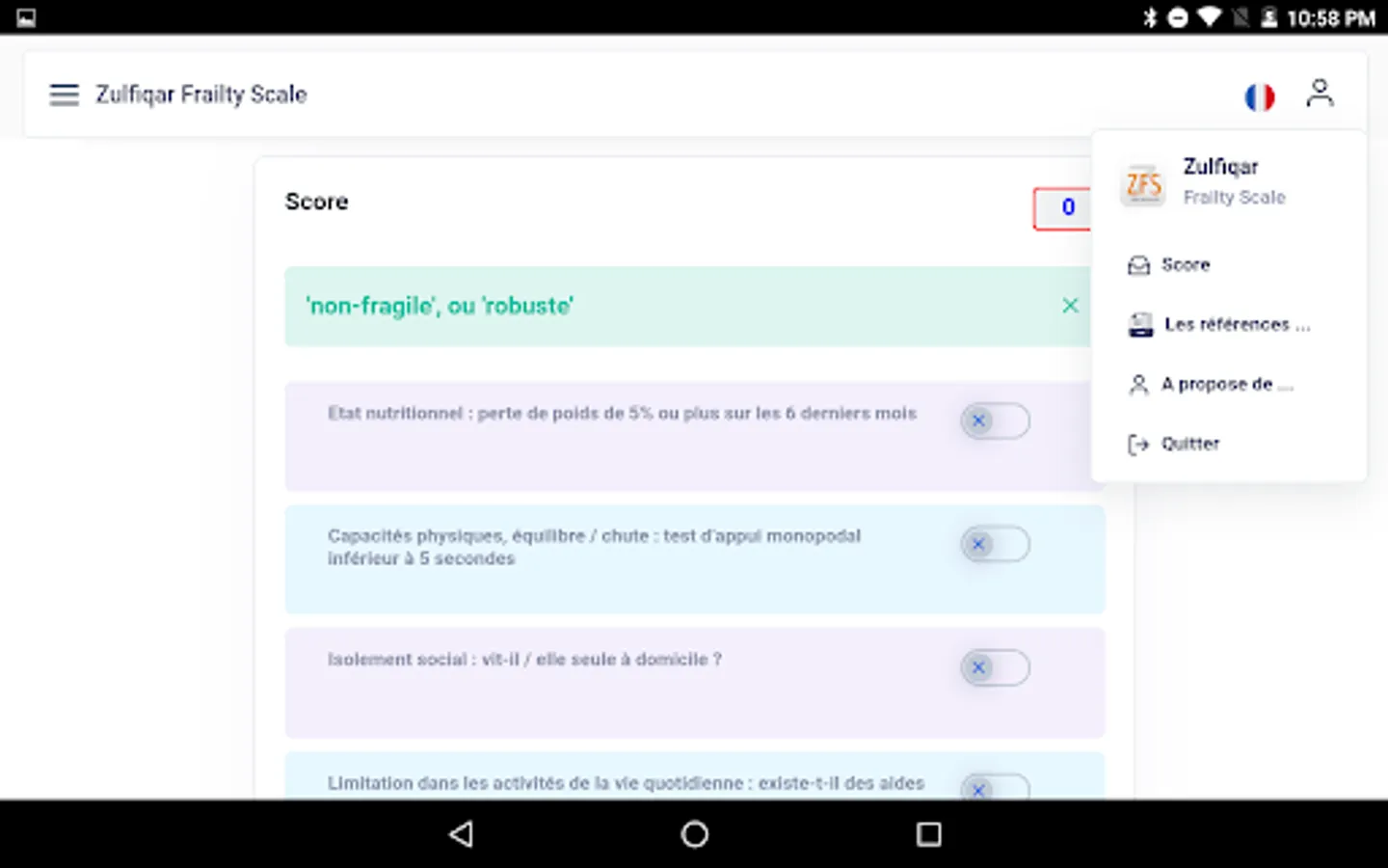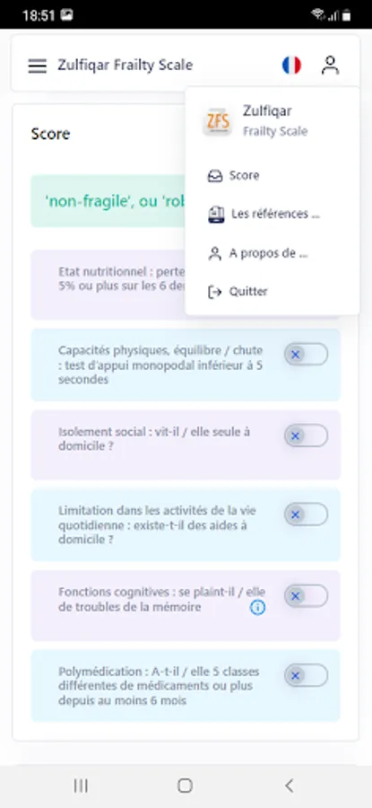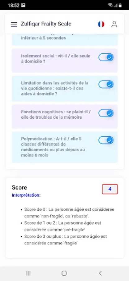 Very few frailty scales are used by general practitioners as they are time consuming and cumbersome. We designed a new scale for the rapid detection of frailty. Methods: We developed a frailty screening tool for use in primary care, referred to as the Zulfiqar Frailty Scale (ZFS). This scale was tested in a general practitioner’s office for six months in Plancoët, France. Only patients over 75 years of age with Activities of Daily Living (ADL) ≥4 were included. The objective of this research was to validate the scale, evaluate its performance, and compare this screening tool with other scales such as the Fried Scale, the Gerontopole Frailty Screening Tool (GFST), the modified Short Emergency Geriatric Assessment (mSEGA) Grid A, and the Comprehensive Geriatric Assessment (CGA). Results: A total of 102 patients were included, with a mean age of 82.65 ± 4.79; 55 were women and 47 were men. The percentage of frail subjects was 63.7% in our scale, 67.7% in the mSEGA grid A, 75.5% in the GFST, and 60.8% for the Fried criteria. After a comprehensive geriatric assessment, frailty syndrome was found in 57 patients (55.9%). In general, both scales showed solid performance, and differences between them in the sample were minimal. As the CGA showed a prevalence of frailty of 55.9%, a similar prevalence threshold for the ZFS (i.e., 64% at the threshold ≥3 could be assessed). The completion time for our scale was less than two minutes, and staff required no training beforehand. Its sensitivity was 83.9%, and its specificity was 67.5%. Its positive predictive value was 80%, and its negative predictive value was 73%. The Pearson correlations between the geriatric scores were all strong and roughly equivalent to each other. Conclusions: Our frailty screening scale is simple, relevant, and rapid (taking less than two minutes).
