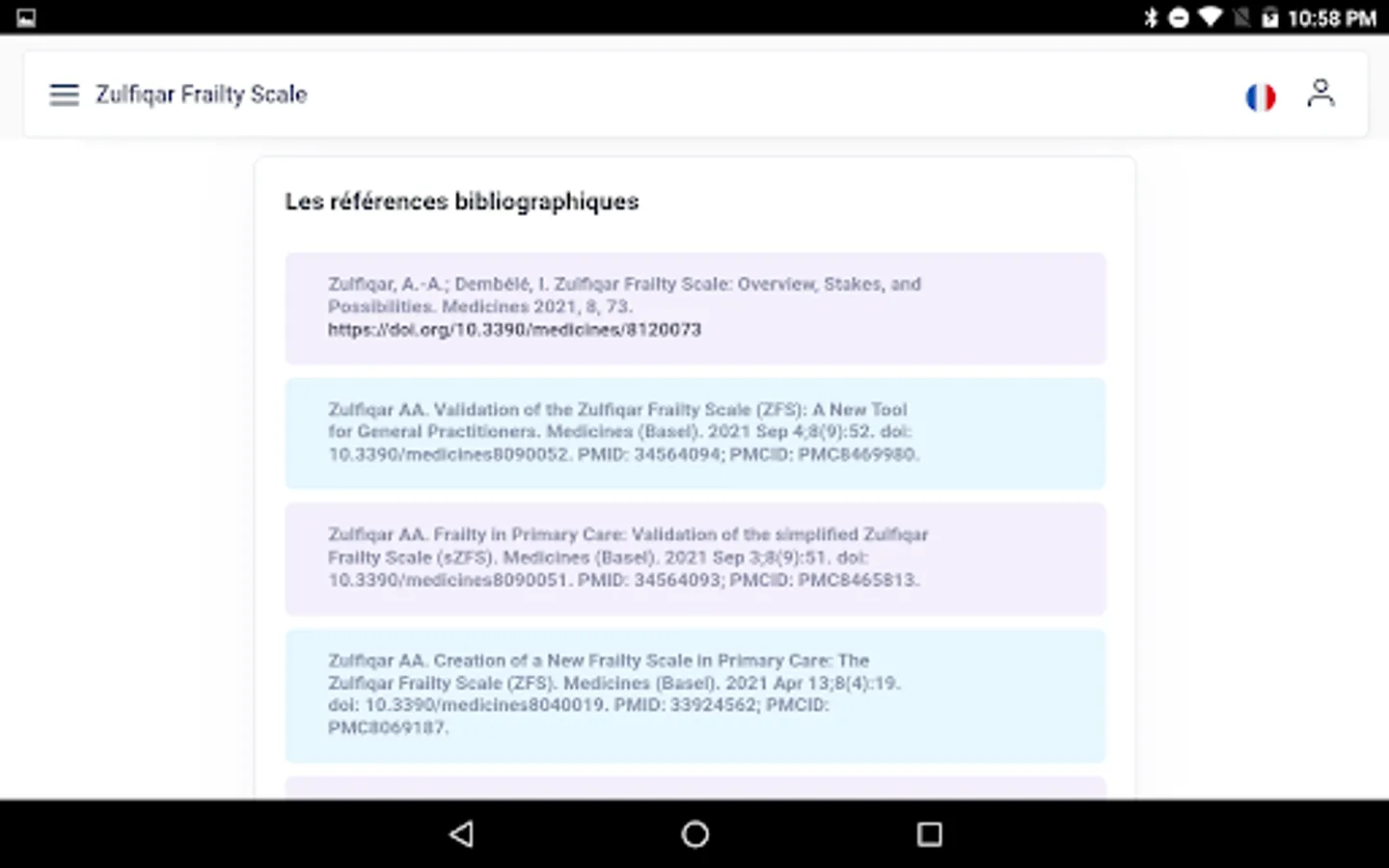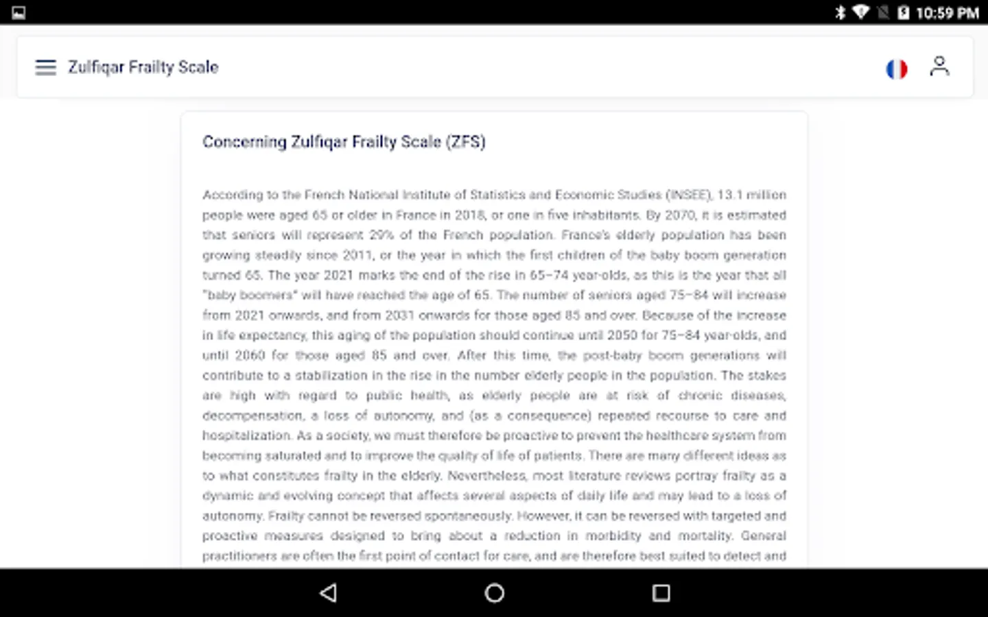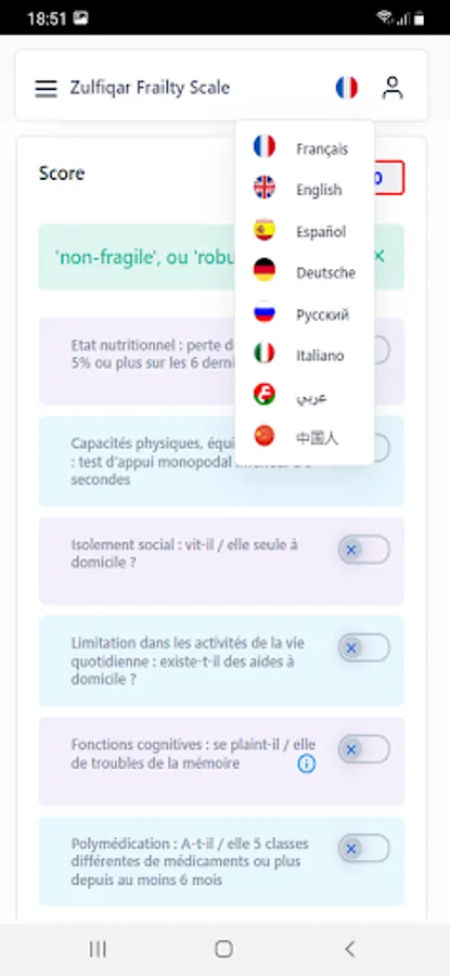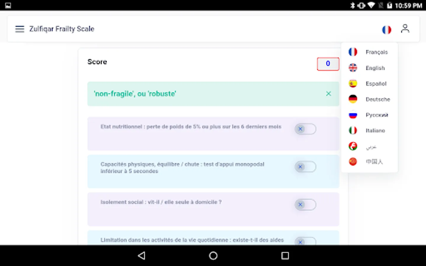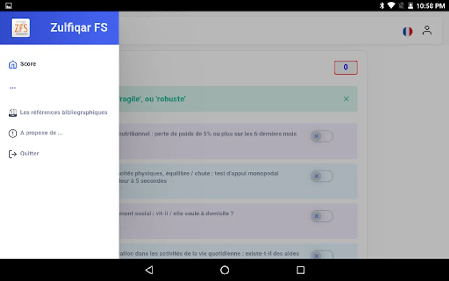 Very few frailty scales are used by general practitioners as they are time consuming and cumbersome. We designed a new scale for the rapid detection of frailty. Methods: We developed a frailty screening tool for use in primary care, referred to as the Zulfiqar Frailty Scale (ZFS). This scale was tested in a general practitioner’s office for six months in Plancoët, France. Only patients over 75 years of age with Activities of Daily Living (ADL) ≥4 were included. The objective of this research was to validate the scale, evaluate its performance, and compare this screening tool with other scales such as the Fried Scale, the Gerontopole Frailty Screening Tool (GFST), the modified Short Emergency Geriatric Assessment (mSEGA) Grid A, and the Comprehensive Geriatric Assessment (CGA). Results: A total of 102 patients were included, with a mean age of 82.65 ± 4.79; 55 were women and 47 were men. The percentage of frail subjects was 63.7% in our scale, 67.7% in the mSEGA grid A, 75.5% in the GFST, and 60.8% for the Fried criteria. After a comprehensive geriatric assessment, frailty syndrome was found in 57 patients (55.9%). In general, both scales showed solid performance, and differences between them in the sample were minimal. As the CGA showed a prevalence of frailty of 55.9%, a similar prevalence threshold for the ZFS (i.e., 64% at the threshold ≥3 could be assessed). The completion time for our scale was less than two minutes, and staff required no training beforehand. Its sensitivity was 83.9%, and its specificity was 67.5%. Its positive predictive value was 80%, and its negative predictive value was 73%. The Pearson correlations between the geriatric scores were all strong and roughly equivalent to each other. Conclusions: Our frailty screening scale is simple, relevant, and rapid (taking less than two minutes).