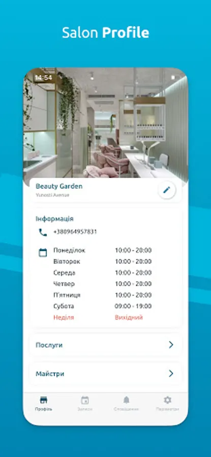 Opening hours, location, contacts, beauty professionals, service catalog, prices, current offers.