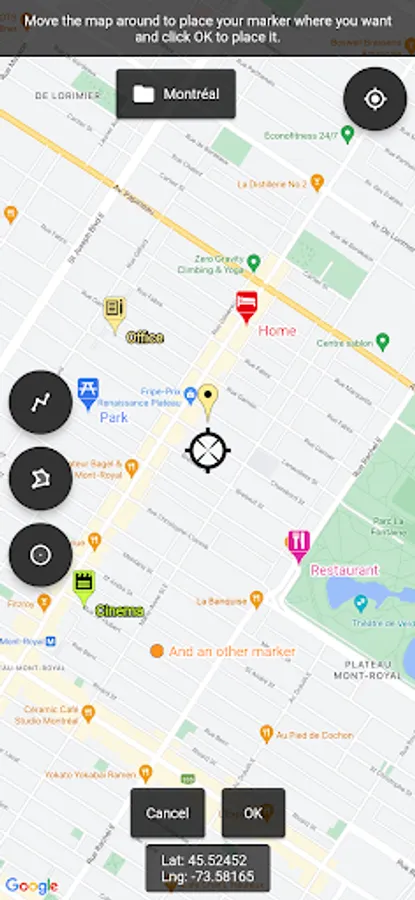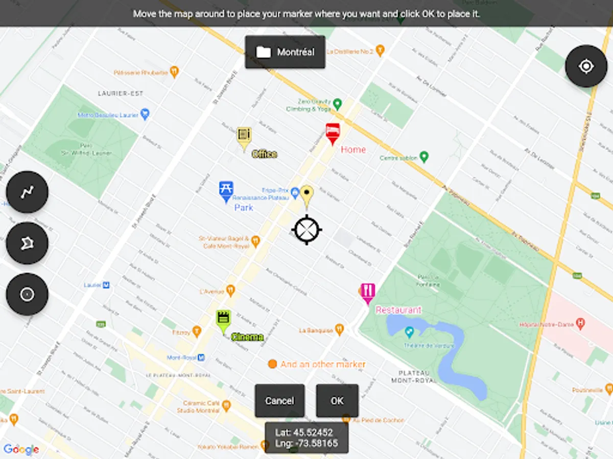This app uses Google Maps and other sources in order to allow you to place markers even without internet connection.