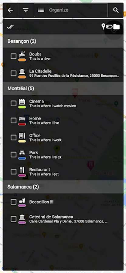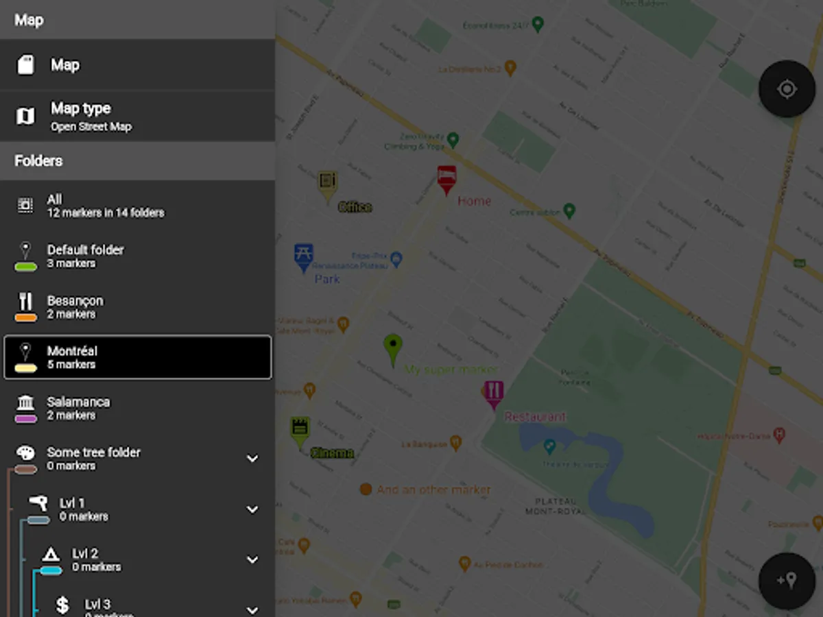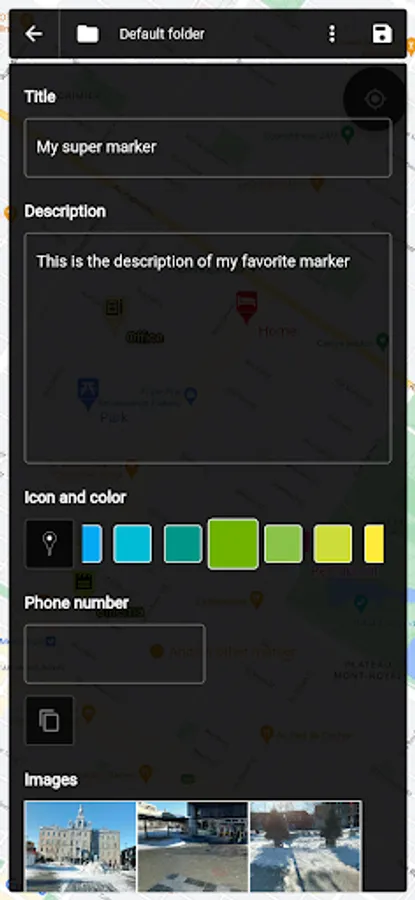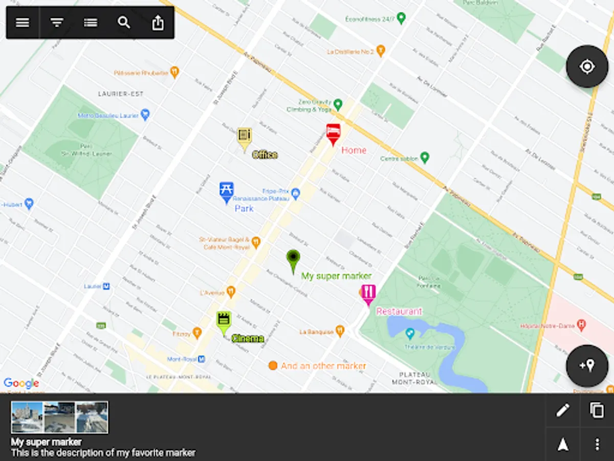 • Set a title, a description, a date, a color, an icon and pictures for each marker, and move them freely on the map