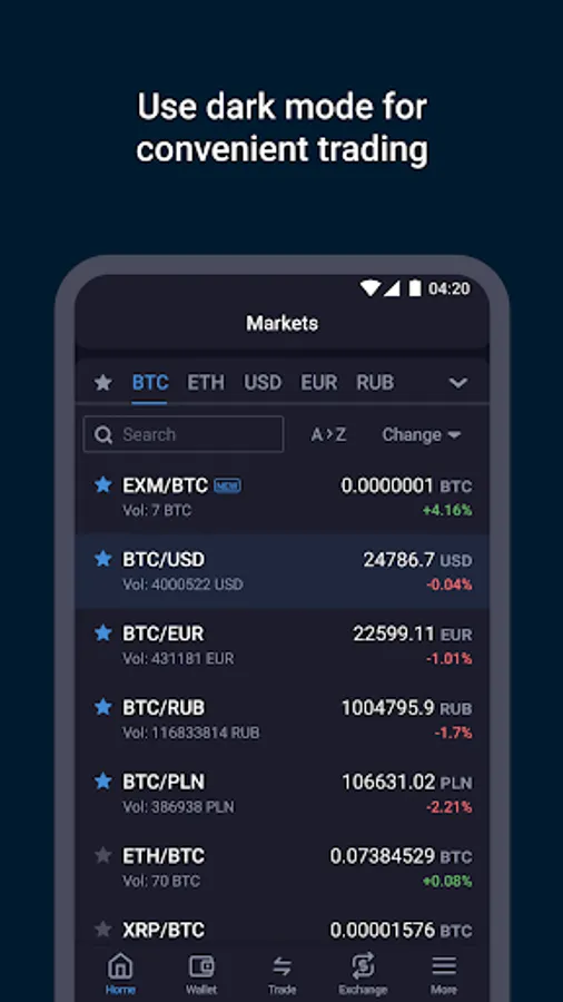 Use the app as a wallet to safely store your funds. More than 57 cryptocurrencies are available on EXMO, including bitcoin (BTC), ethereum (ETH), litecoin (LTC) and ripple (XRP), as well as fiat currencies such as dollars, euros and pounds. Your wallet is reliably protected by the LedgerVault technology and is available at any time.